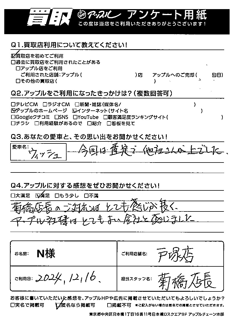 A.愛車名:ウィッシュ 今回は査定で他社さんが上でした。