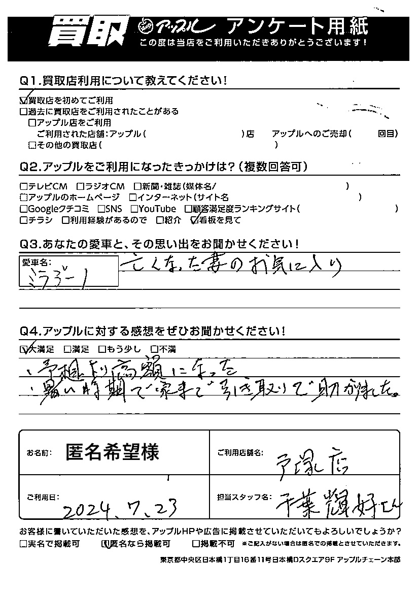 予想より高額になった。暑い時期で家まで引き取りで助かりました。