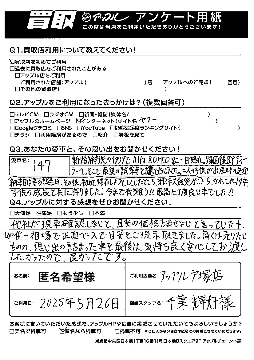 た。高くは売りたいものの、思い出の詰まった車を最後は気持ちよく安心してお渡ししたかったので、良かったで