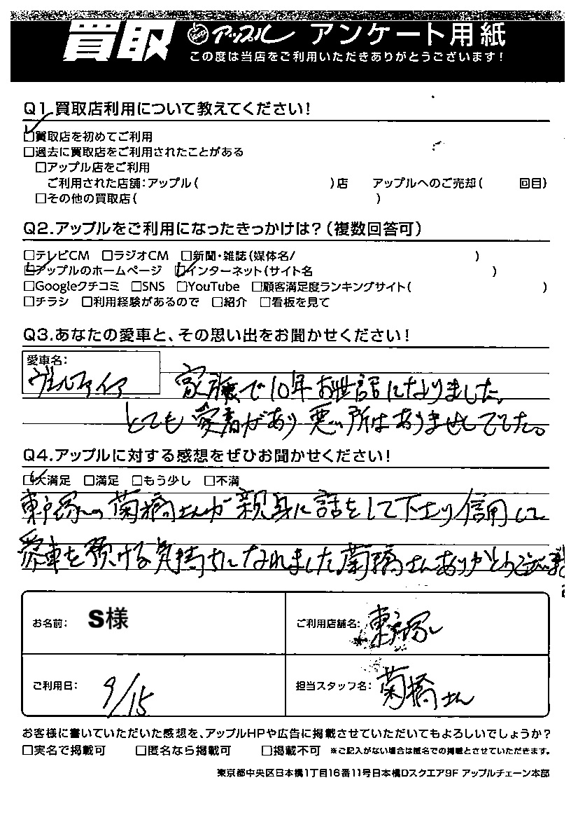 東戸塚の菊橋さんが親身に話をして下さり信用して愛車を預ける気持ちになれました。菊橋さんありがとうござい