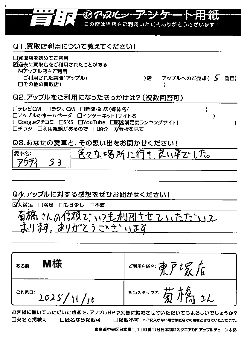 A.愛車名:菊橋さんへの信頼でいつも利用させていただいております。ありがとうございます。