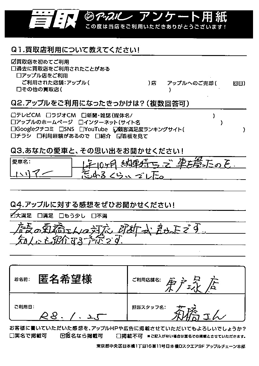 A.大満足 店長の菊橋さんの対応・即断は良かったです。知人にも紹介する予定です。