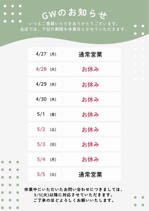 GW休業のお知らせ