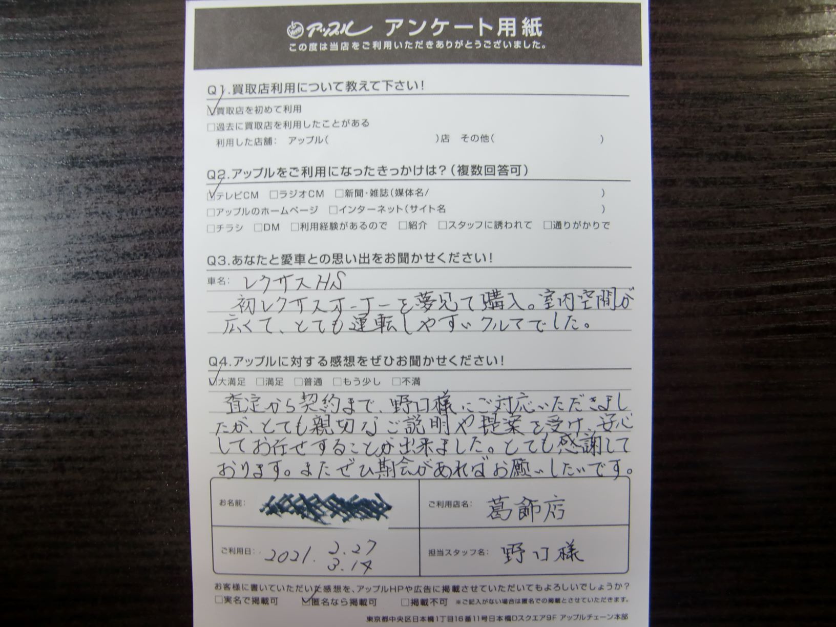 お車のご相談・ 査定だけでもOK! カンタン 入力 30秒 アップルがブランド買取始めました! お電話でも受付中! 受付時間10:00~19:00 03-6662-6181 お車のご相談・ 査定だけでもOK! カンタン 入力 30秒 アップルがブランド買取始めました! お電話でも受付中! 受付時間10:00~19:00 03-6662-6181 アップルがブランド買取始めました! お電話でも受付中! 受付時間10:00~19:00 03-6662-6181 店舗情報 在庫車 スタッフ紹介 ブログ お客様の声 キャンペーン 無料査定 click お客様の声 ご記入日: 2021/03/14 Z様 車名:レクサス HS (国内仕様 右H) 前へ 次へ お客様の声一覧を見る