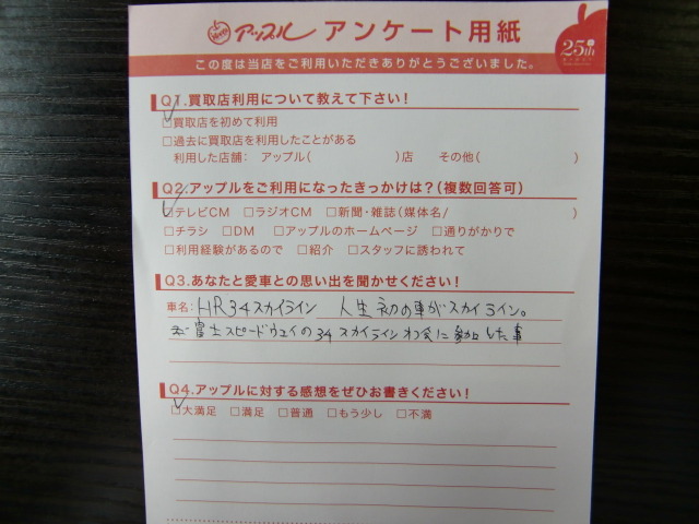 お車のご相談・ 査定だけでもOK! カンタン 入力 30秒 アップルがブランド買取始めました! お電話でも受付中! 受付時間10:00~19:00 03-6662-6181 お車のご相談・ 査定だけでもOK! カンタン 入力 30秒 アップルがブランド買取始めました! お電話でも受付中! 受付時間10:00~19:00 03-6662-6181 アップルがブランド買取始めました! お電話でも受付中! 受付時間10:00~19:00 03-6662-6181 店舗情報 在庫車 スタッフ紹介 ブログ お客様の声 キャンペーン 無料査定 click お客様の声 ご記入日: 2014/02/18 H様 HR34スカイライン 人生初の車がスカイライン。富士スピードウェイの34スカイラインオフ会に参加した事 前へ 次へ お客様の声一覧を見る