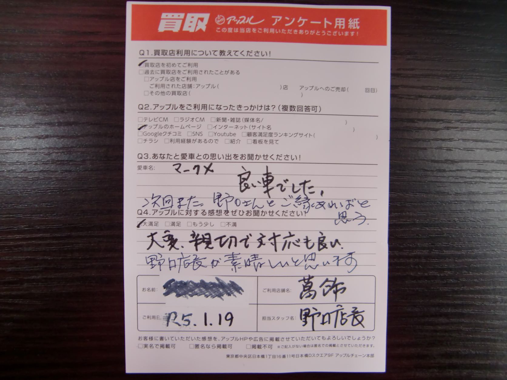 お車のご相談・ 査定だけでもOK! カンタン 入力 30秒 アップルがブランド買取始めました! お電話でも受付中! 受付時間10:00~19:00 03-6662-6181 お車のご相談・ 査定だけでもOK! カンタン 入力 30秒 アップルがブランド買取始めました! お電話でも受付中! 受付時間10:00~19:00 03-6662-6181 アップルがブランド買取始めました! お電話でも受付中! 受付時間10:00~19:00 03-6662-6181 店舗情報 在庫車 スタッフ紹介 ブログ お客様の声 キャンペーン 無料査定 click お客様の声 ご記入日: 2023/01/19 Y様 車名:トヨタ マークX 前へ 次へ お客様の声一覧を見る