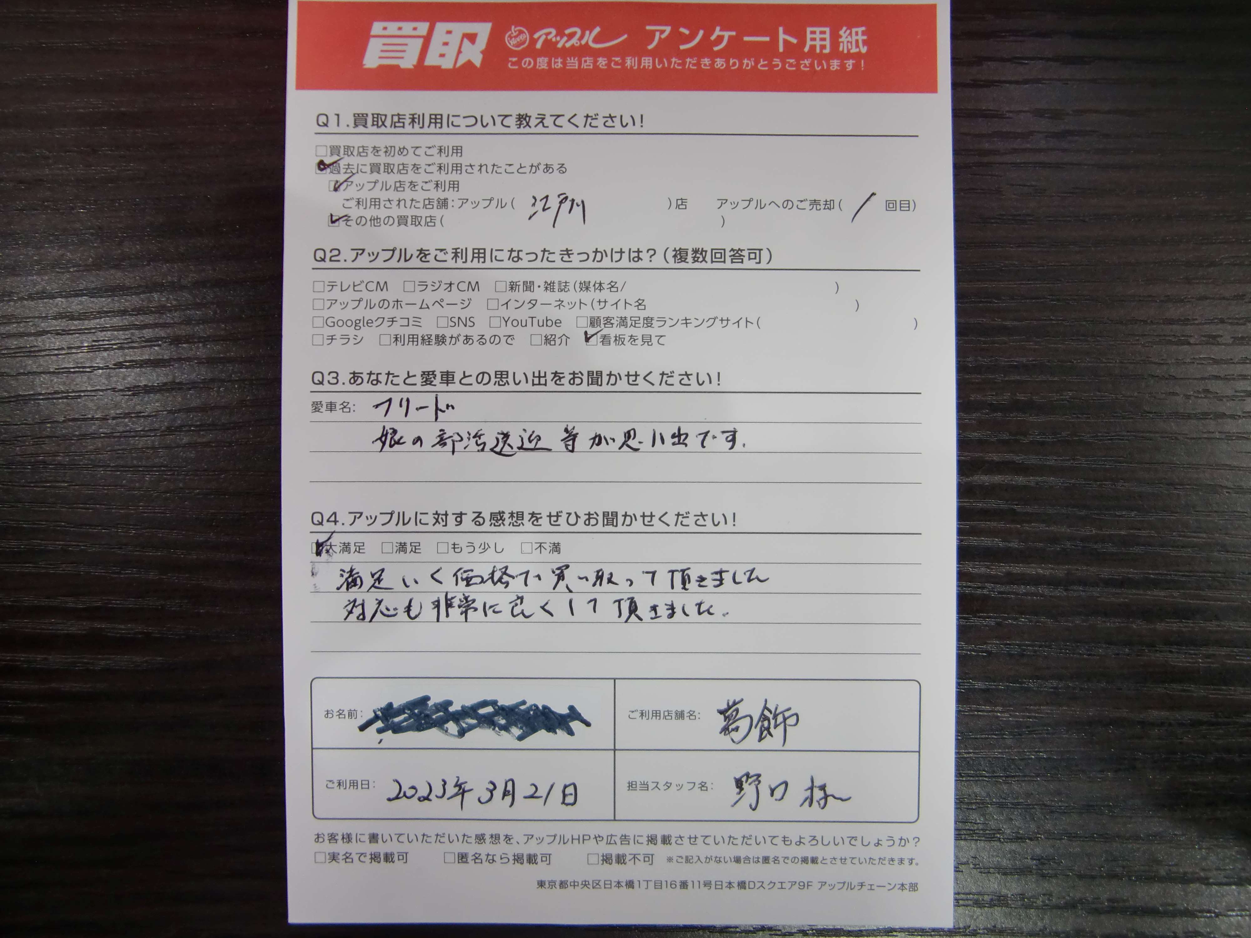 お車のご相談・ 査定だけでもOK! カンタン 入力 30秒 アップルがブランド買取始めました! お電話でも受付中! 受付時間10:00~19:00 03-6662-6181 お車のご相談・ 査定だけでもOK! カンタン 入力 30秒 アップルがブランド買取始めました! お電話でも受付中! 受付時間10:00~19:00 03-6662-6181 アップルがブランド買取始めました! お電話でも受付中! 受付時間10:00~19:00 03-6662-6181 店舗情報 在庫車 スタッフ紹介 ブログ お客様の声 キャンペーン 無料査定 click お客様の声 ご記入日: 2023/03/21 K様 車名:ホンダ フリード(H28年9月以降のハイブリッド含む) 前へ 次へ お客様の声一覧を見る