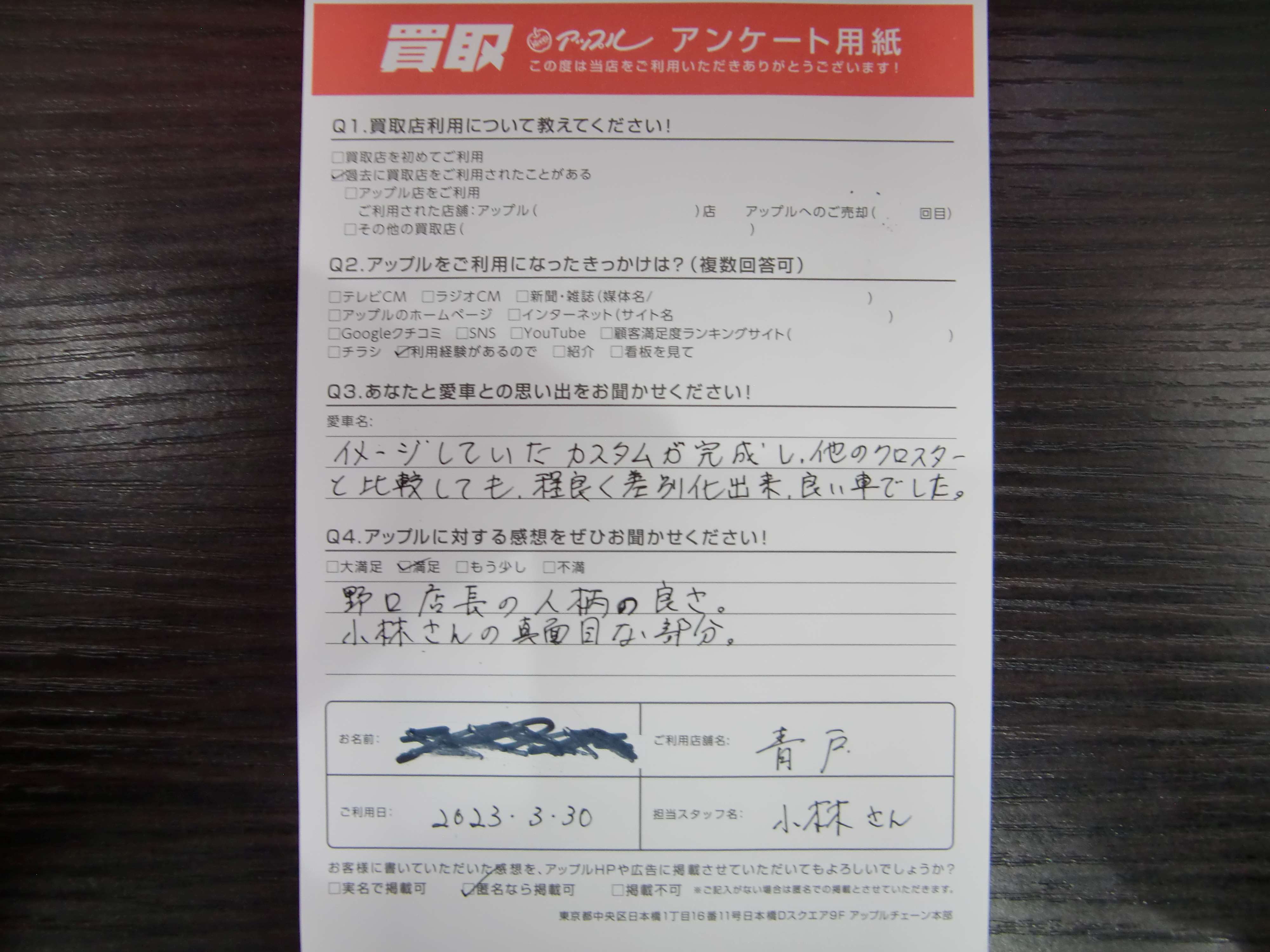 お車のご相談・ 査定だけでもOK! カンタン 入力 30秒 アップルがブランド買取始めました! お電話でも受付中! 受付時間10:00~19:00 03-6662-6181 お車のご相談・ 査定だけでもOK! カンタン 入力 30秒 アップルがブランド買取始めました! お電話でも受付中! 受付時間10:00~19:00 03-6662-6181 アップルがブランド買取始めました! お電話でも受付中! 受付時間10:00~19:00 03-6662-6181 店舗情報 在庫車 スタッフ紹介 ブログ お客様の声 キャンペーン 無料査定 click お客様の声 ご記入日: 2023/03/30 W様 車名:ホンダ フィット(H25年9月以降のハイブリッド含む) 前へ 次へ お客様の声一覧を見る