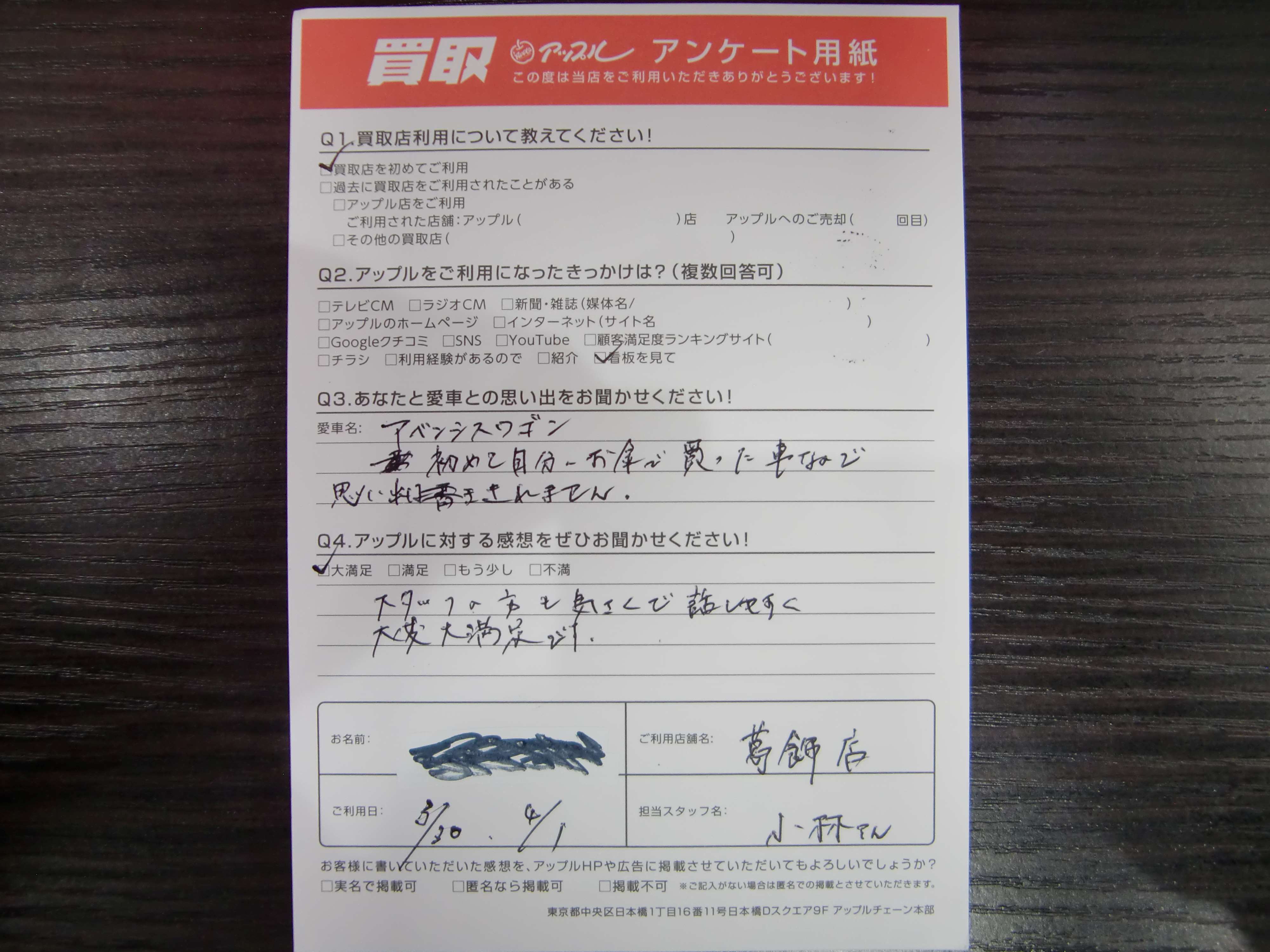 お車のご相談・ 査定だけでもOK! カンタン 入力 30秒 アップルがブランド買取始めました! お電話でも受付中! 受付時間10:00~19:00 03-6662-6181 お車のご相談・ 査定だけでもOK! カンタン 入力 30秒 アップルがブランド買取始めました! お電話でも受付中! 受付時間10:00~19:00 03-6662-6181 アップルがブランド買取始めました! お電話でも受付中! 受付時間10:00~19:00 03-6662-6181 店舗情報 在庫車 スタッフ紹介 ブログ お客様の声 キャンペーン 無料査定 click お客様の声 ご記入日: 2023/04/01 K様 車名:トヨタ アベンシスワゴン 前へ 次へ お客様の声一覧を見る