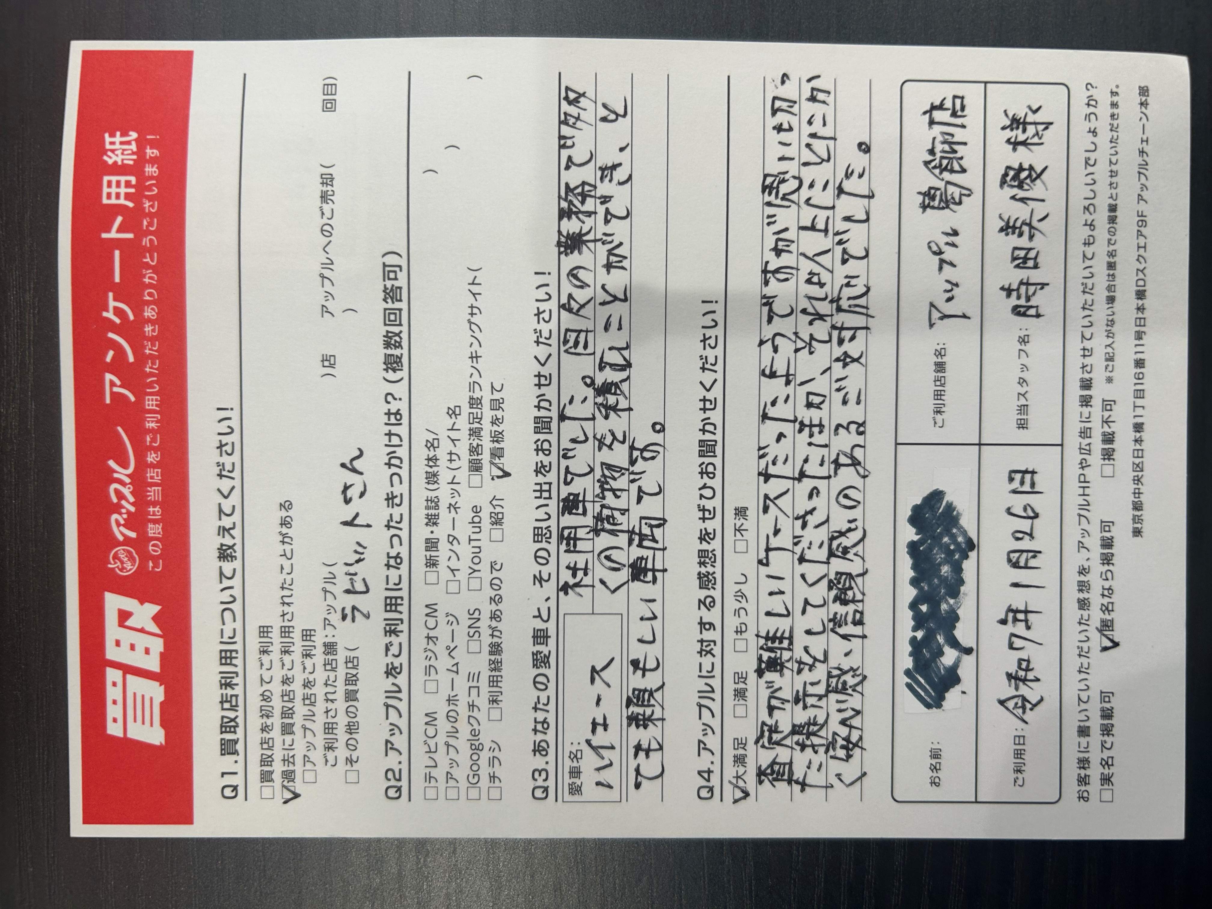 お車のご相談・ 査定だけでもOK! カンタン 入力 30秒 アップルがブランド買取始めました! お電話でも受付中! 受付時間10:00~19:00 03-6662-6181 お車のご相談・ 査定だけでもOK! カンタン 入力 30秒 アップルがブランド買取始めました! お電話でも受付中! 受付時間10:00~19:00 03-6662-6181 アップルがブランド買取始めました! お電話でも受付中! 受付時間10:00~19:00 03-6662-6181 店舗情報 在庫車 スタッフ紹介 ブログ お客様の声 キャンペーン 無料査定 click お客様の声 ご記入日: 2025/01/26 K様 車名:トヨタ ハイエースバン 査定が難しいケースだったようですが思い切った提示をしてくださったほか、それ以上にとにかく安心感・信頼感のあるご対応でした。 前へ 次へ お客様の声一覧を見る