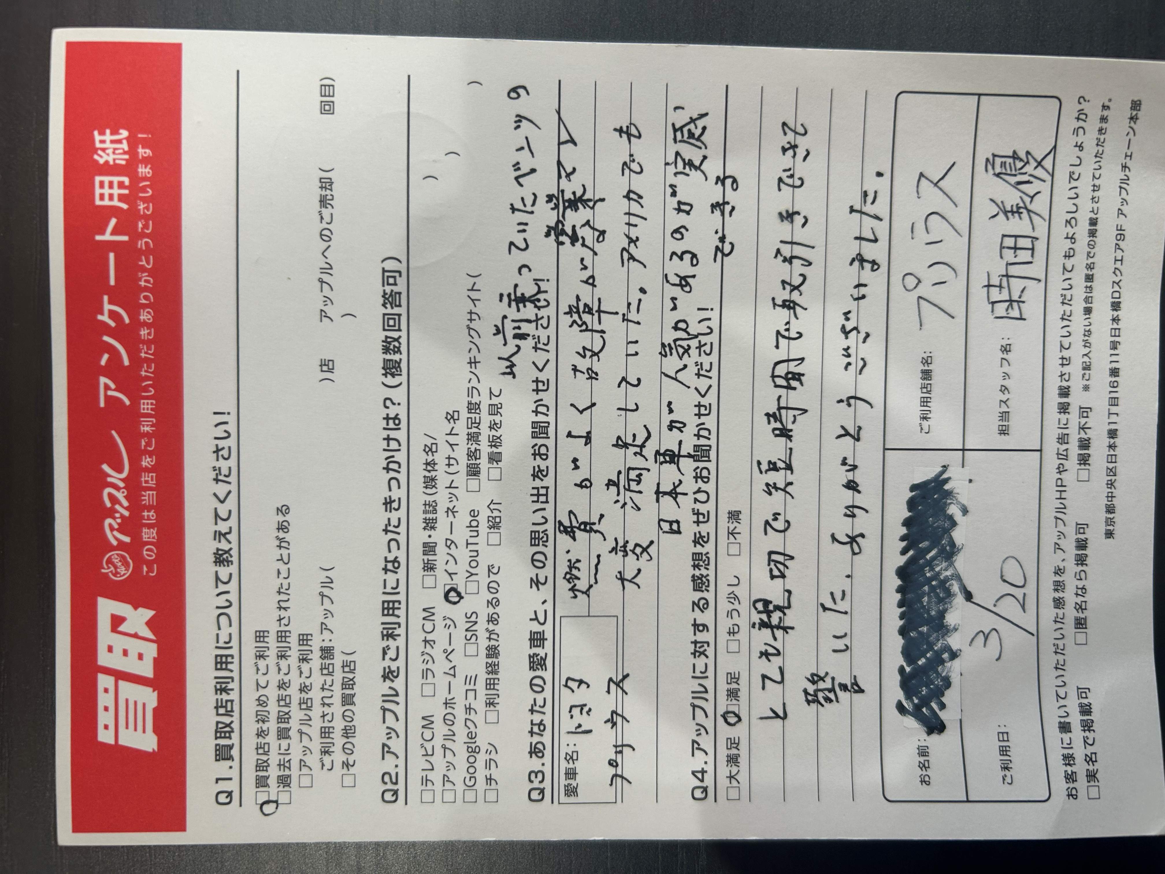 お車のご相談・ 査定だけでもOK! カンタン 入力 30秒 アップルがブランド買取始めました! お電話でも受付中! 受付時間10:00~19:00 03-6662-6181 お車のご相談・ 査定だけでもOK! カンタン 入力 30秒 アップルがブランド買取始めました! お電話でも受付中! 受付時間10:00~19:00 03-6662-6181 アップルがブランド買取始めました! お電話でも受付中! 受付時間10:00~19:00 03-6662-6181 店舗情報 在庫車 スタッフ紹介 ブログ お客様の声 キャンペーン 無料査定 click お客様の声 ご記入日: 2025/03/20 M様 車名:トヨタ プリウス(2023年3月~のPHVを含む) とても親切で短時間で取引できて驚いた。ありがとうございました。 前へ 次へ お客様の声一覧を見る