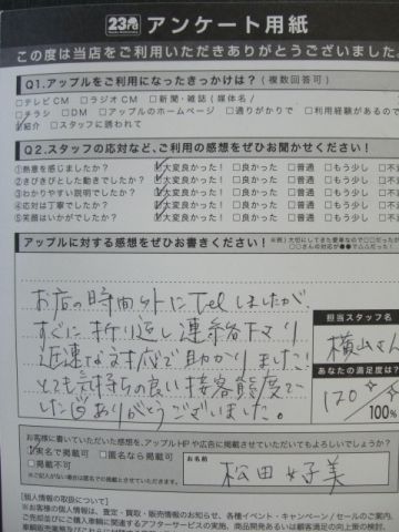 お車のご相談・ 査定だけでもOK! カンタン 入力 30秒 アップルがブランド買取始めました! お電話でも受付中! 受付時間10:00~19:00 03-6662-6181 お車のご相談・ 査定だけでもOK! カンタン 入力 30秒 アップルがブランド買取始めました! お電話でも受付中! 受付時間10:00~19:00 03-6662-6181 アップルがブランド買取始めました! お電話でも受付中! 受付時間10:00~19:00 03-6662-6181 店舗情報 在庫車 スタッフ紹介 ブログ お客様の声 キャンペーン 無料査定 click お客様の声 ご記入日: 2012/06/08 松田 好美様 お店の時間外にTELしましたが、すぐに折り返し連絡下さり迅速な対応で助かりました!とても気持ちの良い接客態度でした。ありがとうございました。 前へ 次へ お客様の声一覧を見る