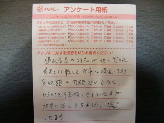 お車のご相談・ 査定だけでもOK! カンタン 入力 30秒 アップルがブランド買取始めました! お電話でも受付中! 受付時間10:00~19:00 03-6662-6181 お車のご相談・ 査定だけでもOK! カンタン 入力 30秒 アップルがブランド買取始めました! お電話でも受付中! 受付時間10:00~19:00 03-6662-6181 アップルがブランド買取始めました! お電話でも受付中! 受付時間10:00~19:00 03-6662-6181 店舗情報 在庫車 スタッフ紹介 ブログ お客様の声 キャンペーン 無料査定 click お客様の声 ご記入日: 2013/01/23 T様 横山店長の対応が他の買取業者と比較して非常に満足しています。買取額の問題だけでなく、いろいろと説明してもらった事が非常に役に立ちました。満足してます。 前へ 次へ お客様の声一覧を見る