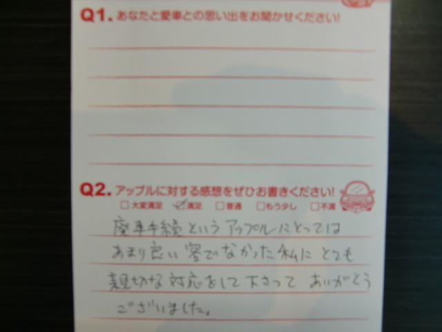 お車のご相談・ 査定だけでもOK! カンタン 入力 30秒 アップルがブランド買取始めました! お電話でも受付中! 受付時間10:00~19:00 03-6662-6181 お車のご相談・ 査定だけでもOK! カンタン 入力 30秒 アップルがブランド買取始めました! お電話でも受付中! 受付時間10:00~19:00 03-6662-6181 アップルがブランド買取始めました! お電話でも受付中! 受付時間10:00~19:00 03-6662-6181 店舗情報 在庫車 スタッフ紹介 ブログ お客様の声 キャンペーン 無料査定 click お客様の声 ご記入日: 2013/06/08 K様 廃車手続というアップルにとってはあまり良い客でなかった私にとても親切な対応をして下さってありがとうございました。 前へ 次へ お客様の声一覧を見る