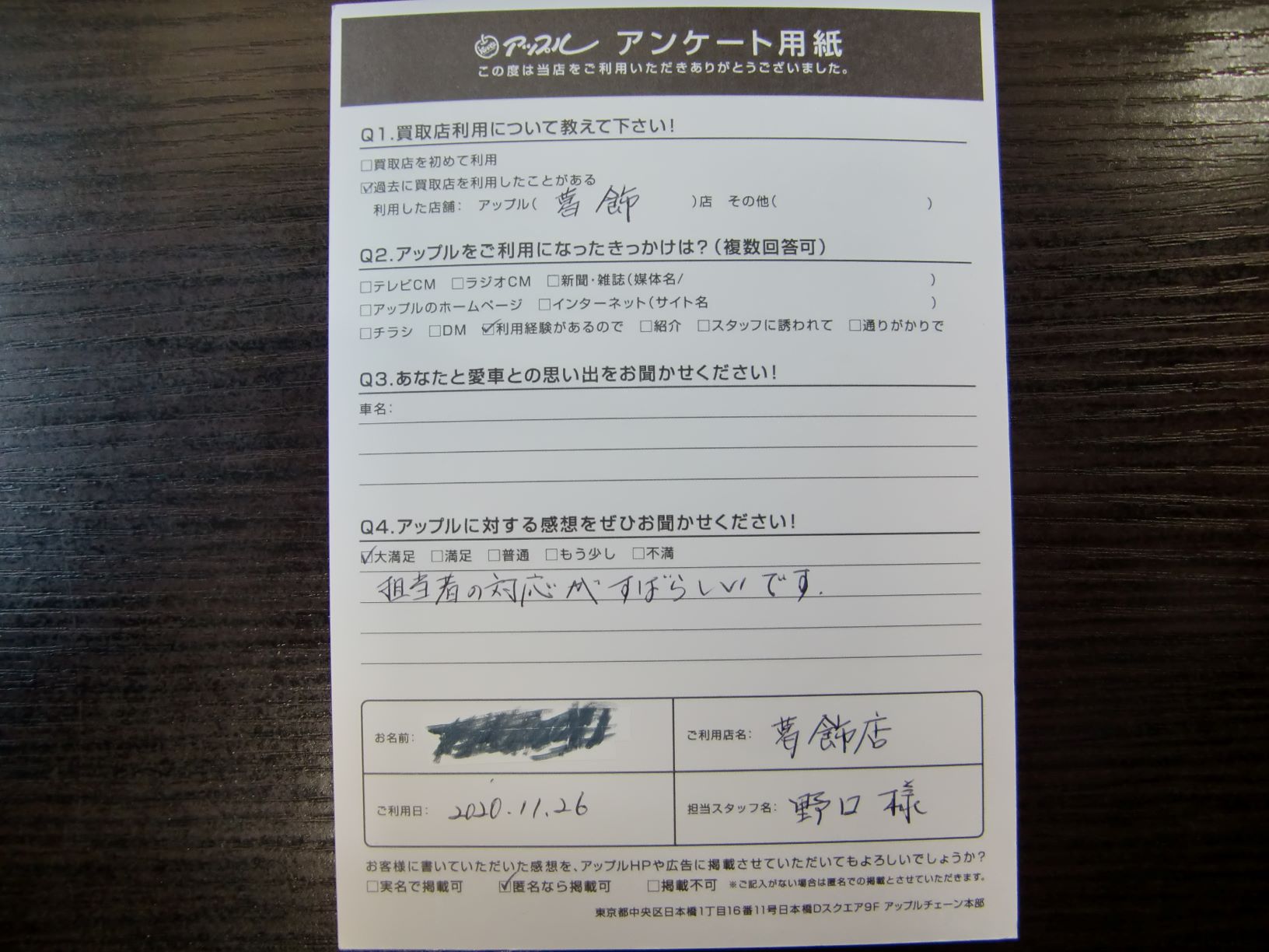 お車のご相談・ 査定だけでもOK! カンタン 入力 30秒 アップルがブランド買取始めました! お電話でも受付中! 受付時間10:00~19:00 03-6662-6181 お車のご相談・ 査定だけでもOK! カンタン 入力 30秒 アップルがブランド買取始めました! お電話でも受付中! 受付時間10:00~19:00 03-6662-6181 アップルがブランド買取始めました! お電話でも受付中! 受付時間10:00~19:00 03-6662-6181 店舗情報 在庫車 スタッフ紹介 ブログ お客様の声 キャンペーン 無料査定 click お客様の声 ご記入日: 2020/11/26 N様 車名:トヨタ ハイエースバン 前へ 次へ お客様の声一覧を見る
