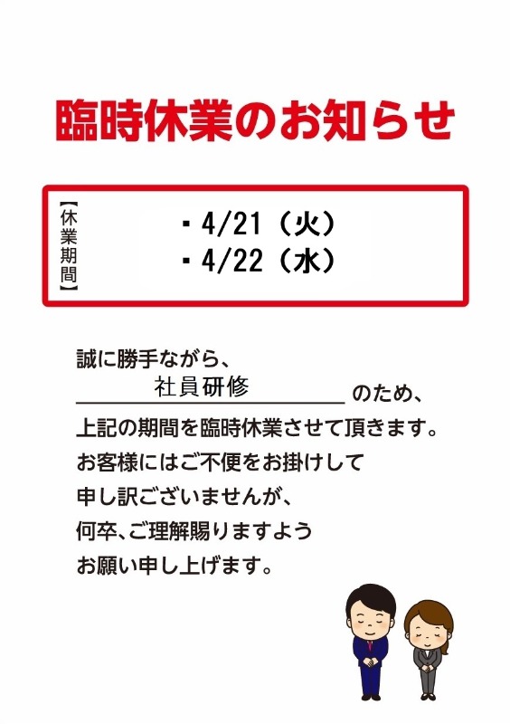 誠に勝手ながら4/21(火)は社員研修の為臨時休業とさせて頂きます。