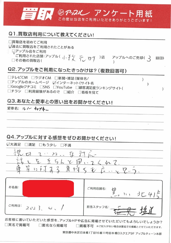 お車のご相談・ 査定だけでもOK! カンタン 入力 30秒 アップルがブランド買取始めました! お電話でも受付中! 受付時間10:00~19:00 ※毎週水曜定休日 052-508-9641 お車のご相談・ 査定だけでもOK! カンタン 入力 30秒 アップルがブランド買取始めました! お電話でも受付中! 受付時間10:00~19:00 ※毎週水曜定休日 052-508-9641 アップルがブランド買取始めました! お電話でも受付中! 受付時間10:00~19:00 ※毎週水曜定休日 052-508-9641 店舗情報 在庫車 スタッフ紹介 ブログ お客様の声 キャンペーン お得 無料査定 click お客様の声 ご記入日: 2023/04/01 匿名希望キャプチャー様 車名:ルノー キャプチャー 親切ていねいな対応、話をきちんと聞いてくれて車等に対する気持ちも良いと思う。 前へ 次へ お客様の声一覧を見る