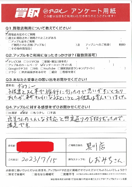 お車のご相談・ 査定だけでもOK! カンタン 入力 30秒 アップルがブランド買取始めました! お電話でも受付中! 受付時間10:00~19:00 ※毎週水曜定休日 052-508-9641 お車のご相談・ 査定だけでもOK! カンタン 入力 30秒 アップルがブランド買取始めました! お電話でも受付中! 受付時間10:00~19:00 ※毎週水曜定休日 052-508-9641 アップルがブランド買取始めました! お電話でも受付中! 受付時間10:00~19:00 ※毎週水曜定休日 052-508-9641 店舗情報 在庫車 スタッフ紹介 ブログ お客様の声 キャンペーン お得 無料査定 click お客様の声 ご記入日: 2023/07/15 匿名希望ヴォクシー様 車名:トヨタ ヴォクシー 子供達とよく車で旅行に行ったので思いがすごくありましたが、車がキレイになるよというと子供達は喜んでいました。店員さんのしんしな対応と想定通りの下取りだったので満足です。 前へ 次へ お客様の声一覧を見る