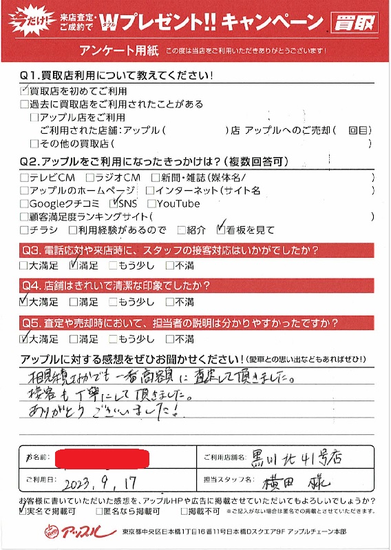 お車のご相談・ 査定だけでもOK! カンタン 入力 30秒 アップルがブランド買取始めました! お電話でも受付中! 受付時間10:00~19:00 ※毎週水曜定休日 052-508-9641 お車のご相談・ 査定だけでもOK! カンタン 入力 30秒 アップルがブランド買取始めました! お電話でも受付中! 受付時間10:00~19:00 ※毎週水曜定休日 052-508-9641 アップルがブランド買取始めました! お電話でも受付中! 受付時間10:00~19:00 ※毎週水曜定休日 052-508-9641 店舗情報 在庫車 スタッフ紹介 ブログ お客様の声 キャンペーン お得 無料査定 click お客様の声 ご記入日: 2023/09/17 匿名希望シャラン様 車名:フォルクスワーゲン シャラン 相見積もりしてなかでも一番高額に査定して頂きました。接客も丁寧にして頂きました。ありがとうございました! 前へ 次へ お客様の声一覧を見る