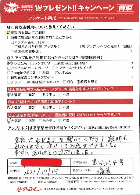 お車のご相談・ 査定だけでもOK! カンタン 入力 30秒 アップルがブランド買取始めました! お電話でも受付中! 受付時間10:00~19:00 ※毎週水曜定休日 052-508-9641 お車のご相談・ 査定だけでもOK! カンタン 入力 30秒 アップルがブランド買取始めました! お電話でも受付中! 受付時間10:00~19:00 ※毎週水曜定休日 052-508-9641 アップルがブランド買取始めました! お電話でも受付中! 受付時間10:00~19:00 ※毎週水曜定休日 052-508-9641 店舗情報 在庫車 スタッフ紹介 ブログ お客様の声 キャンペーン お得 無料査定 click お客様の声 ご記入日: 2023/10/15 匿名希望Bクラス様 車名:メルセデス・ベンツ Bクラス 査定でわがままを聞いてくださり説明も分かりやすく安心してお任せできました。本当にありがとうございました。 前へ 次へ お客様の声一覧を見る