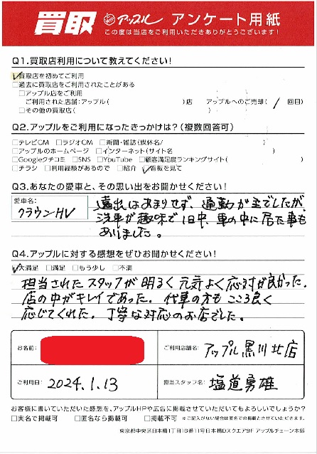 匿名希望クラウンHV様 車名:トヨタ クラウンハイブリッド (~H24年12月)