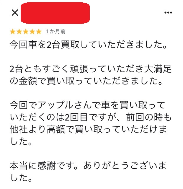 今回でアップルさんで車を買い取っていただくのは2回目ですが、前回の時も他社より高額で買い取っていただけました。