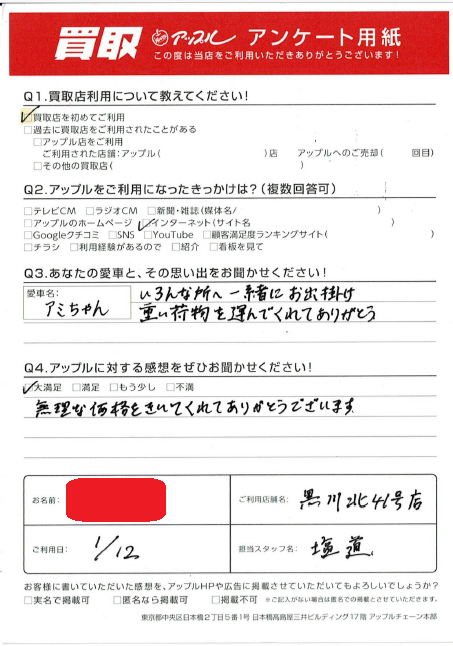 お車のご相談・ 査定だけでもOK! カンタン 入力 30秒 アップルがブランド買取始めました! お電話でも受付中! 受付時間10:00~19:00 ※毎週水曜定休日 052-508-9641 お車のご相談・ 査定だけでもOK! カンタン 入力 30秒 アップルがブランド買取始めました! お電話でも受付中! 受付時間10:00~19:00 ※毎週水曜定休日 052-508-9641 アップルがブランド買取始めました! お電話でも受付中! 受付時間10:00~19:00 ※毎週水曜定休日 052-508-9641 店舗情報 在庫車 スタッフ紹介 ブログ お客様の声 キャンペーン お得 無料査定 click お客様の声 ご記入日: 2026/01/12 匿名希望ヴィッツ様 車名:トヨタ ヴィッツ いろんな所へ一緒にお出掛け重い荷物を運んでくれてありがとう。無理な価格をきいてくれてありがとうございます。 前へ 次へ お客様の声一覧を見る