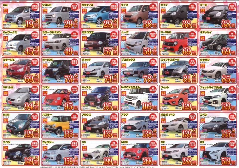 お車のご相談・ 査定だけでもOK! カンタン 入力 30秒 アップルがブランド買取始めました! お電話でも受付中! 受付時間10:00 ~ 18:30 0120-665-977 お車のご相談・ 査定だけでもOK! カンタン 入力 30秒 アップルがブランド買取始めました! お電話でも受付中! 受付時間10:00 ~ 18:30 0120-665-977 アップルがブランド買取始めました! お電話でも受付中! 受付時間10:00 ~ 18:30 0120-665-977 店舗情報 在庫車 スタッフ紹介 ブログ お客様の声 キャンペーン お得 無料査定 click [ 入庫情報 ] 2019/03/11 (月) 16:49 決算 大感謝セール 皆さま、こんにちは四日市南店の出口です!お知らせが遅くなってしまい申し訳ありません。ただいまアップルでは決算 大感謝セールを開催中です!期間は3月17日、日曜日まで!!大人気車種、たくさん取り揃えております☆このチャンスをお見逃しなく!!!なお、ありがたいことにどんどん広告掲載車両が売れております!当店の掲載車両もすでに販売済みの車両もございますのでご来店前に、必ず在庫確認をお願いします(>_<)気になる車両が売れてしまう前に是非一度、お問い合わせください♪たくさんのお問い合わせお待ちしております☆ 2019-03-11 16:49:00 新しい記事へ 古い記事へ 最新記事 4月は自動車税全額負担させていただきます前向き・リフレッシュ年末の話激辛部活動H26レクサスRC300H Fスポーツ入庫 店舗情報に戻る 月別アーカイブ 2026年04月(2)2026年01月(1)2025年10月(4)2025年09月(1)2025年08月(2)2025年07月(2)2025年06月(2)2025年05月(1)2025年04月(1)2024年10月(3)2024年02月(1)2023年12月(1)2023年09月(2)2023年06月(2)2023年04月(1)2022年07月(1)2022年04月(1)2022年02月(1)2022年01月(3)2021年10月(4)2021年09月(2)2021年08月(5)2021年07月(4)2021年06月(4)2021年05月(4)2021年04月(3)2021年03月(5)2021年02月(5)2021年01月(4)2020年12月(4)2020年11月(2)2020年10月(5)2020年09月(3)2020年08月(5)2020年07月(2)2020年06月(3)2020年05月(6)2020年04月(4)2020年03月(3)2020年02月(5)2020年01月(4)2019年12月(3)2019年11月(6)2019年10月(6)2019年09月(2)2019年08月(5)2019年07月(3)2019年06月(3)2019年05月(3)2019年04月(3)2019年03月(3)2019年02月(2)2019年01月(2)2018年12月(2)2018年11月(1)2018年10月(2)2018年09月(4)2018年08月(2)2018年07月(4)2018年06月(1)2018年05月(1)2018年04月(3)2018年03月(1)2018年02月(1)2018年01月(3)2017年12月(3)2017年11月(4)2017年10月(4)2017年09月(5)2017年08月(2)2017年06月(1)2017年05月(1)2017年03月(1)2017年01月(2)2016年12月(1)2016年11月(2)2016年10月(3)