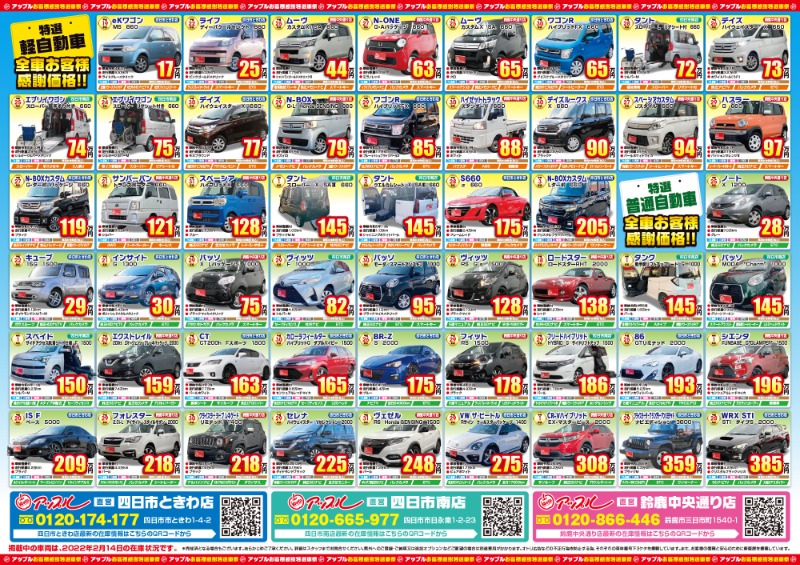 お車のご相談・ 査定だけでもOK! カンタン 入力 30秒 アップルがブランド買取始めました! お電話でも受付中! 受付時間10:00 ~ 18:30 0120-665-977 お車のご相談・ 査定だけでもOK! カンタン 入力 30秒 アップルがブランド買取始めました! お電話でも受付中! 受付時間10:00 ~ 18:30 0120-665-977 アップルがブランド買取始めました! お電話でも受付中! 受付時間10:00 ~ 18:30 0120-665-977 店舗情報 在庫車 スタッフ紹介 ブログ お客様の声 キャンペーン お得 無料査定 click [ つぶやき ] 2022/02/27 (日) 09:56 お客様感謝祭中!!スーパーイベント!! 皆様おはようございます。お得なご情報がございます。お客様感謝祭開催中です!2月26日~3月13日までの期間限定のお得なイベントです。期間中は・ローン特別金利3.9%!・コーティング20%オフなどお得な特典満載!この際にお乗り換えもご検討されてはいかがでしょうか! 2022-02-27 9:56:45 新しい記事へ 古い記事へ 最新記事 4月は自動車税全額負担させていただきます前向き・リフレッシュ年末の話激辛部活動H26レクサスRC300H Fスポーツ入庫 店舗情報に戻る 月別アーカイブ 2026年04月(2)2026年01月(1)2025年10月(4)2025年09月(1)2025年08月(2)2025年07月(2)2025年06月(2)2025年05月(1)2025年04月(1)2024年10月(3)2024年02月(1)2023年12月(1)2023年09月(2)2023年06月(2)2023年04月(1)2022年07月(1)2022年04月(1)2022年02月(1)2022年01月(3)2021年10月(4)2021年09月(2)2021年08月(5)2021年07月(4)2021年06月(4)2021年05月(4)2021年04月(3)2021年03月(5)2021年02月(5)2021年01月(4)2020年12月(4)2020年11月(2)2020年10月(5)2020年09月(3)2020年08月(5)2020年07月(2)2020年06月(3)2020年05月(6)2020年04月(4)2020年03月(3)2020年02月(5)2020年01月(4)2019年12月(3)2019年11月(6)2019年10月(6)2019年09月(2)2019年08月(5)2019年07月(3)2019年06月(3)2019年05月(3)2019年04月(3)2019年03月(3)2019年02月(2)2019年01月(2)2018年12月(2)2018年11月(1)2018年10月(2)2018年09月(4)2018年08月(2)2018年07月(4)2018年06月(1)2018年05月(1)2018年04月(3)2018年03月(1)2018年02月(1)2018年01月(3)2017年12月(3)2017年11月(4)2017年10月(4)2017年09月(5)2017年08月(2)2017年06月(1)2017年05月(1)2017年03月(1)2017年01月(2)2016年12月(1)2016年11月(2)2016年10月(3)