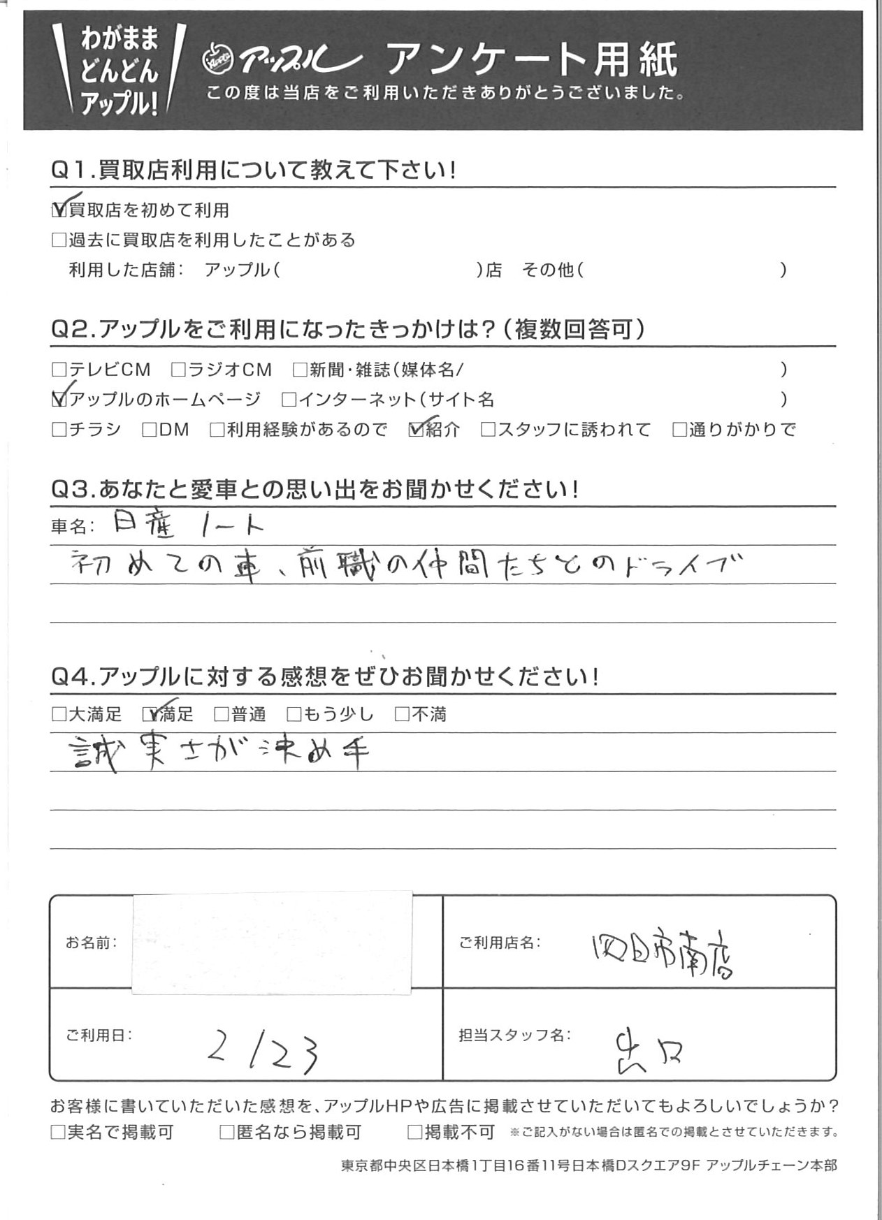 お車のご相談・ 査定だけでもOK! カンタン 入力 30秒 アップルがブランド買取始めました! お電話でも受付中! 受付時間10:00 ~ 18:30 0120-665-977 お車のご相談・ 査定だけでもOK! カンタン 入力 30秒 アップルがブランド買取始めました! お電話でも受付中! 受付時間10:00 ~ 18:30 0120-665-977 アップルがブランド買取始めました! お電話でも受付中! 受付時間10:00 ~ 18:30 0120-665-977 店舗情報 在庫車 スタッフ紹介 ブログ お客様の声 キャンペーン お得 無料査定 click お客様の声 ご記入日: 2021/02/23 匿名様 車名:日産 ノート 初めての車、前職の仲間たちとのドライブ誠実さが決め手 前へ 次へ お客様の声一覧を見る