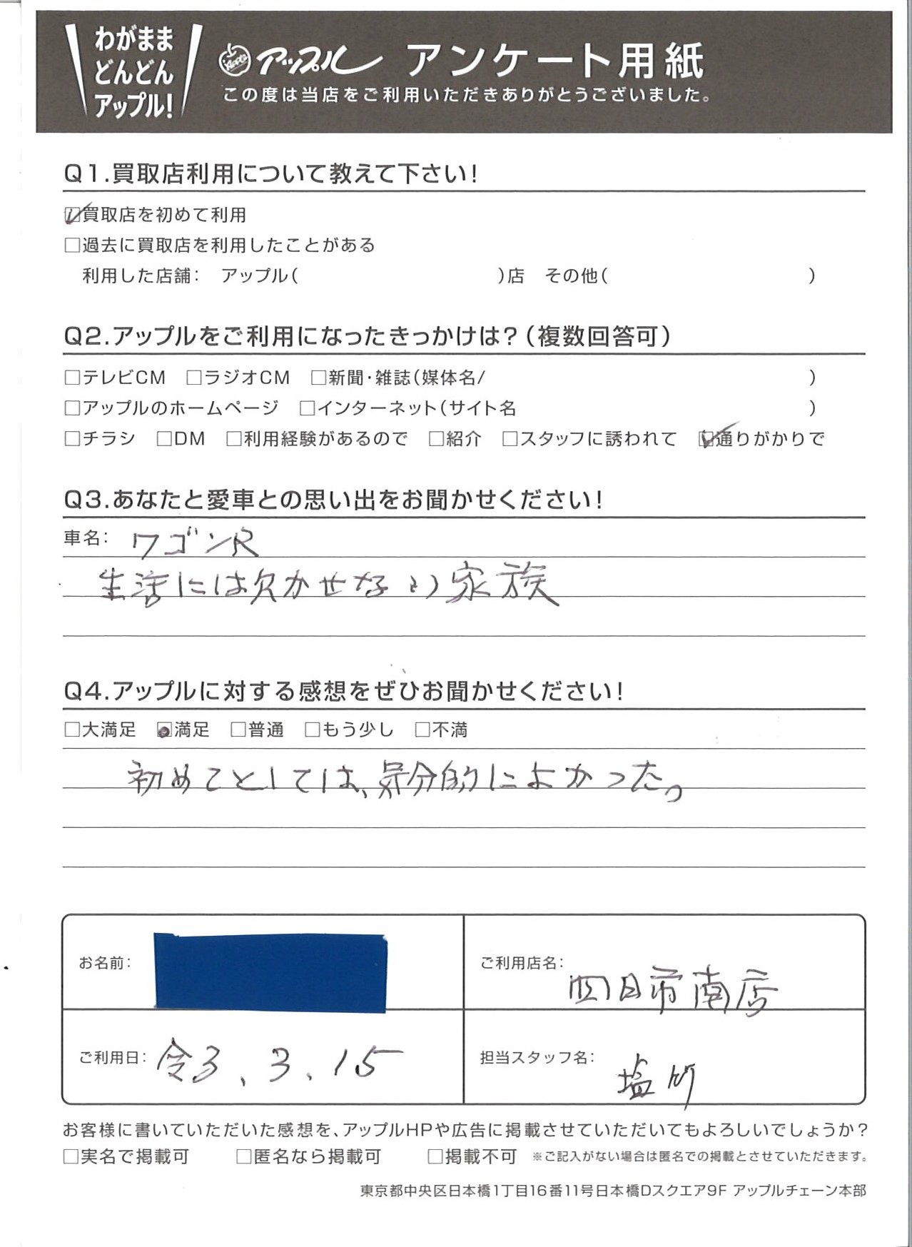 お車のご相談・ 査定だけでもOK! カンタン 入力 30秒 アップルがブランド買取始めました! お電話でも受付中! 受付時間10:00 ~ 18:30 0120-665-977 お車のご相談・ 査定だけでもOK! カンタン 入力 30秒 アップルがブランド買取始めました! お電話でも受付中! 受付時間10:00 ~ 18:30 0120-665-977 アップルがブランド買取始めました! お電話でも受付中! 受付時間10:00 ~ 18:30 0120-665-977 店舗情報 在庫車 スタッフ紹介 ブログ お客様の声 キャンペーン お得 無料査定 click お客様の声 ご記入日: 2021/03/15 匿名様 車名:スズキ ワゴンR 生活には欠かせない家族初めてとしては、気分的に良かった。 前へ 次へ お客様の声一覧を見る