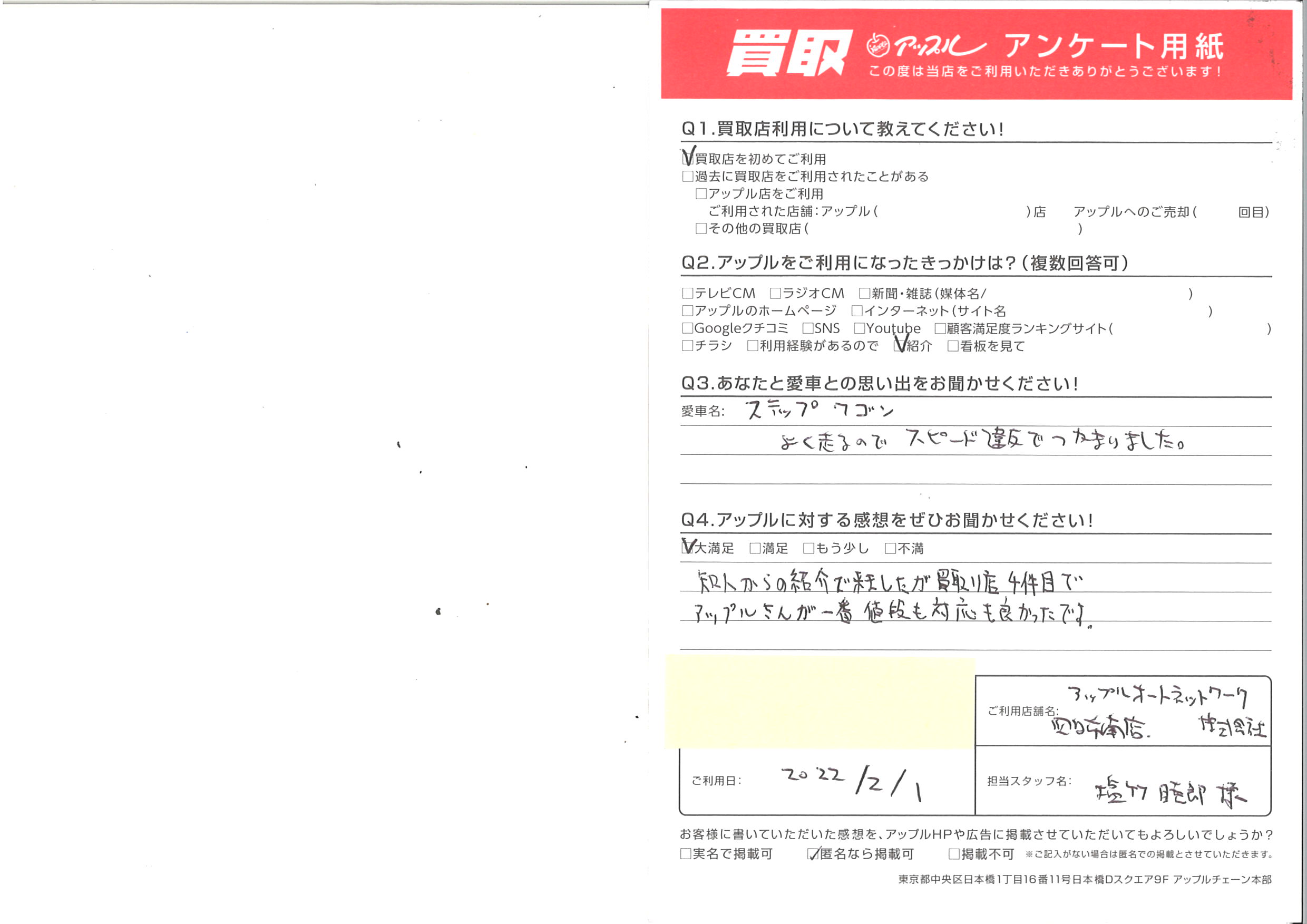 お車のご相談・ 査定だけでもOK! カンタン 入力 30秒 アップルがブランド買取始めました! お電話でも受付中! 受付時間10:00 ~ 18:30 0120-665-977 お車のご相談・ 査定だけでもOK! カンタン 入力 30秒 アップルがブランド買取始めました! お電話でも受付中! 受付時間10:00 ~ 18:30 0120-665-977 アップルがブランド買取始めました! お電話でも受付中! 受付時間10:00 ~ 18:30 0120-665-977 店舗情報 在庫車 スタッフ紹介 ブログ お客様の声 キャンペーン お得 無料査定 click お客様の声 ご記入日: 2022/02/01 三重県四日市市 H・S様 車名:ホンダ ステップワゴン 知人からの紹介で来ましたが買取店4件目でアップルさんが一番値段も対応も良かったです。 前へ 次へ お客様の声一覧を見る
