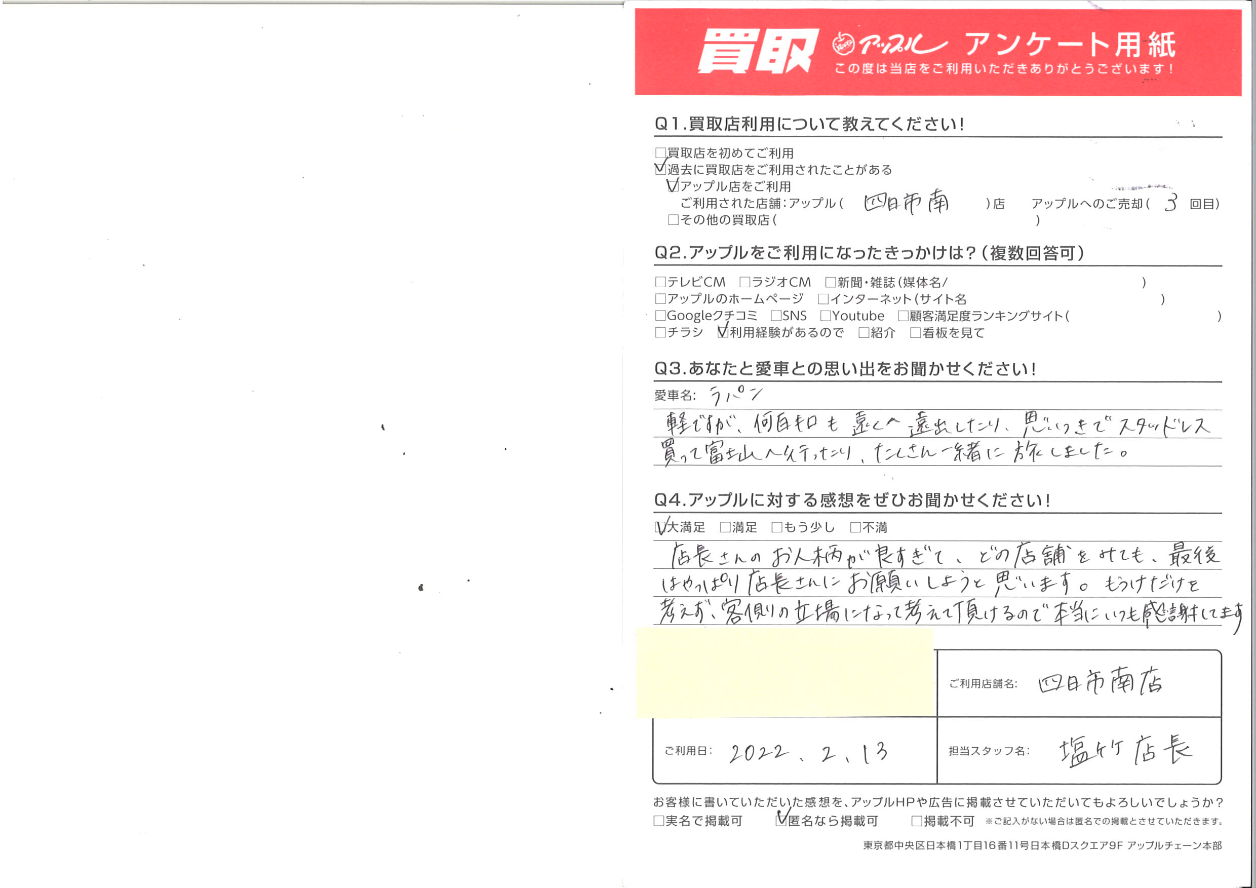 三重県亀山市 A・A様  車名:スズキ アルトラパン ラパン(アルト)