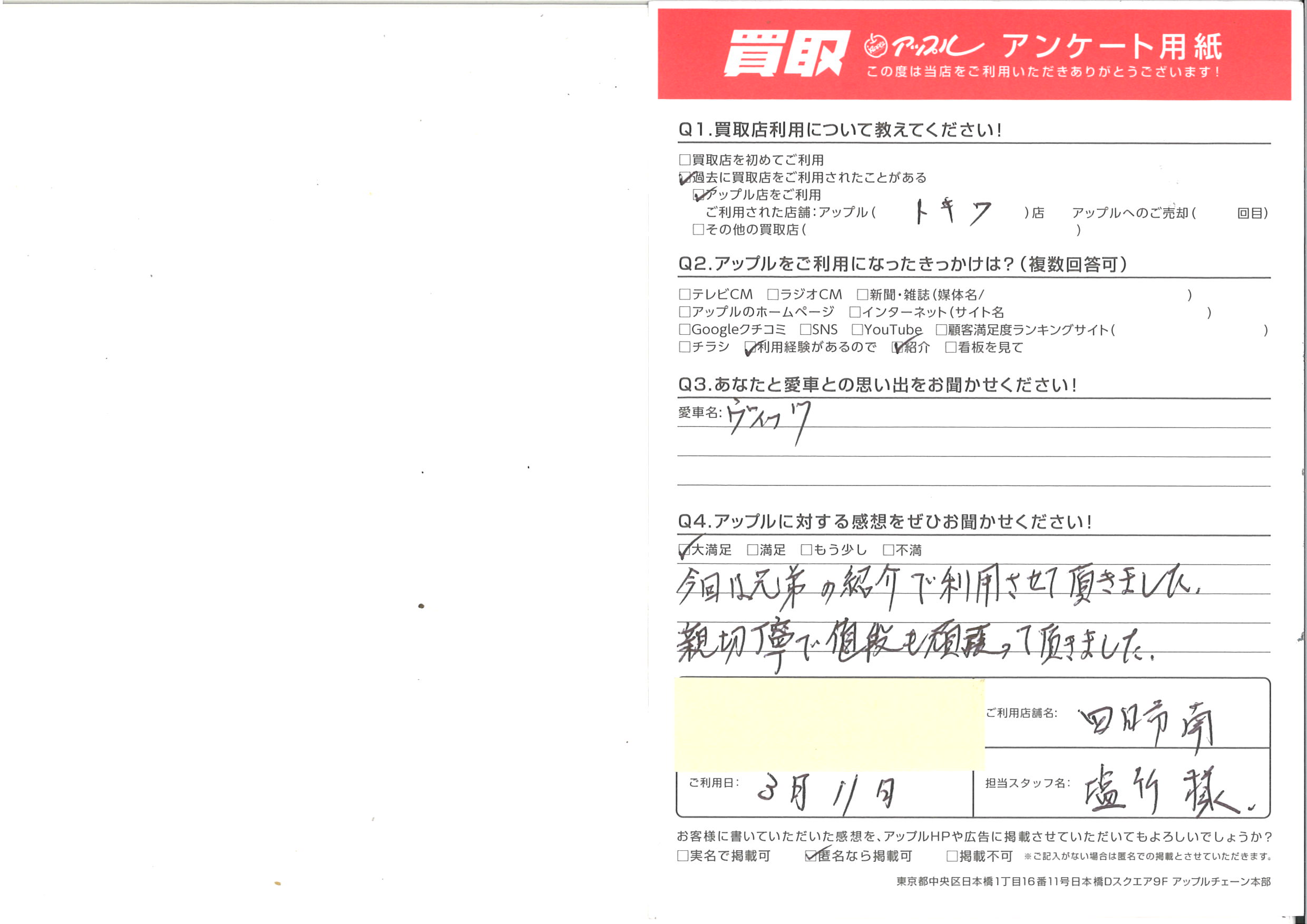お車のご相談・ 査定だけでもOK! カンタン 入力 30秒 アップルがブランド買取始めました! お電話でも受付中! 受付時間10:00 ~ 18:30 0120-665-977 お車のご相談・ 査定だけでもOK! カンタン 入力 30秒 アップルがブランド買取始めました! お電話でも受付中! 受付時間10:00 ~ 18:30 0120-665-977 アップルがブランド買取始めました! お電話でも受付中! 受付時間10:00 ~ 18:30 0120-665-977 店舗情報 在庫車 スタッフ紹介 ブログ お客様の声 キャンペーン お得 無料査定 click お客様の声 ご記入日: -/-/- 四日市市 M様 車名:トヨタ ヴィッツ 今回は兄弟の紹介で利用させて頂きました。親切丁寧で値段も頑張って頂きました。 前へ 次へ お客様の声一覧を見る