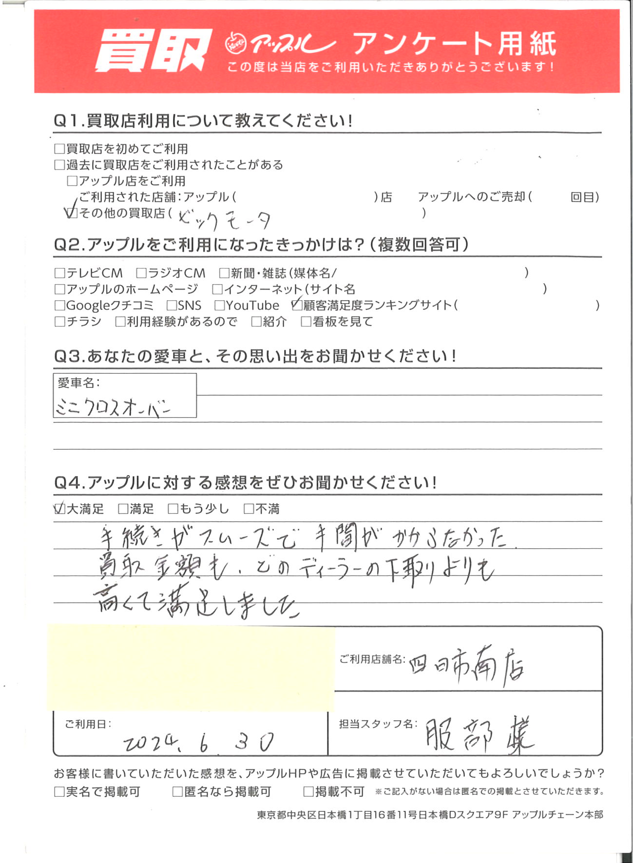 お車のご相談・ 査定だけでもOK! カンタン 入力 30秒 アップルがブランド買取始めました! お電話でも受付中! 受付時間10:00 ~ 18:30 0120-665-977 お車のご相談・ 査定だけでもOK! カンタン 入力 30秒 アップルがブランド買取始めました! お電話でも受付中! 受付時間10:00 ~ 18:30 0120-665-977 アップルがブランド買取始めました! お電話でも受付中! 受付時間10:00 ~ 18:30 0120-665-977 店舗情報 在庫車 スタッフ紹介 ブログ お客様の声 キャンペーン お得 無料査定 click お客様の声 ご記入日: 2024/06/30 T・T様 車名:ミニ ミニクロスオーバー 手続きがスムーズで手間がかからなかった。買取金額もどのディーラーの下取りよりも高くて満足しました。 前へ 次へ お客様の声一覧を見る