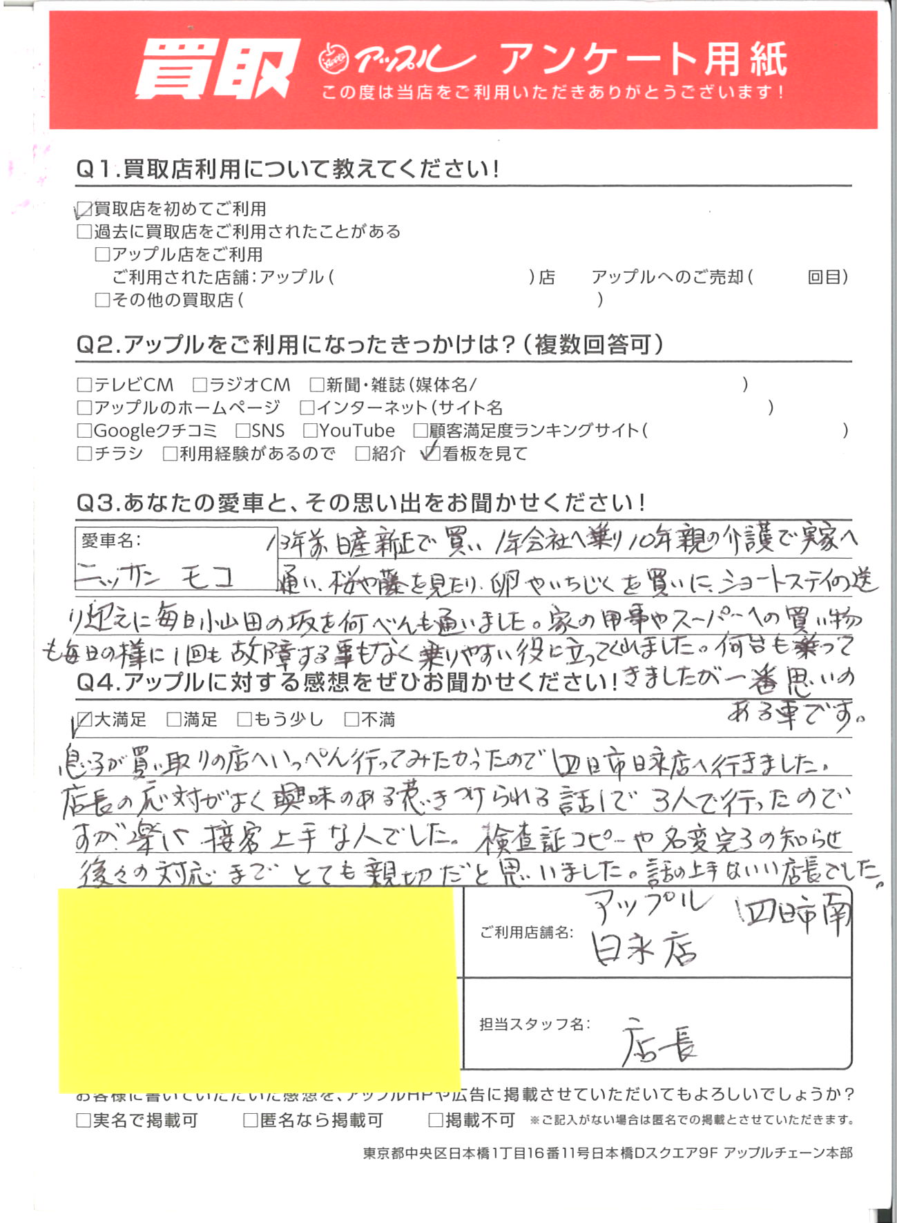 お車のご相談・ 査定だけでもOK! カンタン 入力 30秒 アップルがブランド買取始めました! お電話でも受付中! 受付時間10:00 ~ 18:30 0120-665-977 お車のご相談・ 査定だけでもOK! カンタン 入力 30秒 アップルがブランド買取始めました! お電話でも受付中! 受付時間10:00 ~ 18:30 0120-665-977 アップルがブランド買取始めました! お電話でも受付中! 受付時間10:00 ~ 18:30 0120-665-977 店舗情報 在庫車 スタッフ紹介 ブログ お客様の声 キャンペーン お得 無料査定 click お客様の声 ご記入日: 2025/04/04 三重県・四日市市 N様 車名:日産 モコ 息子が買い取りの店へいっぺん行ってみたかったので四日市日永店へ行きました。店長の対応がよく興味のある惹きつけられる話しで3人で行ったのですが楽しく接客上手な人でした。検査証コピーや名変完了の知らせ、後々の対応までとても親切だと思いました。話の上手ないい店長でした。 前へ 次へ お客様の声一覧を見る
