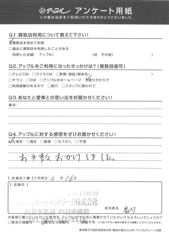 お車のご相談・ 査定だけでもOK! カンタン 入力 30秒 アップルがブランド買取始めました! お電話でも受付中! 受付時間10:00 ~ 18:30 0120-665-977 お車のご相談・ 査定だけでもOK! カンタン 入力 30秒 アップルがブランド買取始めました! お電話でも受付中! 受付時間10:00 ~ 18:30 0120-665-977 アップルがブランド買取始めました! お電話でも受付中! 受付時間10:00 ~ 18:30 0120-665-977 店舗情報 在庫車 スタッフ紹介 ブログ お客様の声 キャンペーン お得 無料査定 click お客様の声 ご記入日: 2016/02/16 Y・K様 お手数おかけしました。 前へ 次へ お客様の声一覧を見る