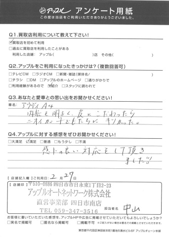 お車のご相談・ 査定だけでもOK! カンタン 入力 30秒 アップルがブランド買取始めました! お電話でも受付中! 受付時間10:00 ~ 18:30 0120-665-977 お車のご相談・ 査定だけでもOK! カンタン 入力 30秒 アップルがブランド買取始めました! お電話でも受付中! 受付時間10:00 ~ 18:30 0120-665-977 アップルがブランド買取始めました! お電話でも受付中! 受付時間10:00 ~ 18:30 0120-665-977 店舗情報 在庫車 スタッフ紹介 ブログ お客様の声 キャンペーン お得 無料査定 click お客様の声 ご記入日: 2016/02/27 H・K様 内装を明るく、皮にこだわったらニオイが子供たちにキツかった。感じの良い対応をして頂きました! 前へ 次へ お客様の声一覧を見る