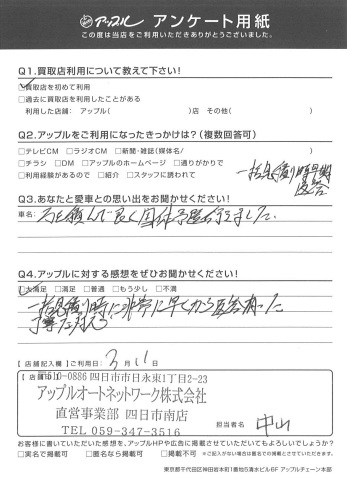 お車のご相談・ 査定だけでもOK! カンタン 入力 30秒 アップルがブランド買取始めました! お電話でも受付中! 受付時間10:00 ~ 18:30 0120-665-977 お車のご相談・ 査定だけでもOK! カンタン 入力 30秒 アップルがブランド買取始めました! お電話でも受付中! 受付時間10:00 ~ 18:30 0120-665-977 アップルがブランド買取始めました! お電話でも受付中! 受付時間10:00 ~ 18:30 0120-665-977 店舗情報 在庫車 スタッフ紹介 ブログ お客様の声 キャンペーン お得 無料査定 click お客様の声 ご記入日: 2016/03/11 M・H様 弓を積んで良く国体予選行きました一括見積り時に非常に早くから返答有った丁寧な対応 前へ 次へ お客様の声一覧を見る