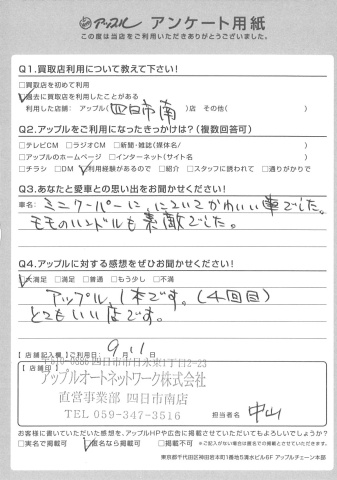 お車のご相談・ 査定だけでもOK! カンタン 入力 30秒 アップルがブランド買取始めました! お電話でも受付中! 受付時間10:00 ~ 18:30 0120-665-977 お車のご相談・ 査定だけでもOK! カンタン 入力 30秒 アップルがブランド買取始めました! お電話でも受付中! 受付時間10:00 ~ 18:30 0120-665-977 アップルがブランド買取始めました! お電話でも受付中! 受付時間10:00 ~ 18:30 0120-665-977 店舗情報 在庫車 スタッフ紹介 ブログ お客様の声 キャンペーン お得 無料査定 click お客様の声 ご記入日: 2016/09/11 K・N様 ミニクーパーににていてかわいい車でした。モモのハンドルも素敵でした。アップル1本です。(4回目)とてもいい店です。 前へ 次へ お客様の声一覧を見る