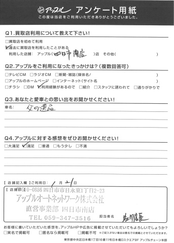 お車のご相談・ 査定だけでもOK! カンタン 入力 30秒 アップルがブランド買取始めました! お電話でも受付中! 受付時間10:00 ~ 18:30 0120-665-977 お車のご相談・ 査定だけでもOK! カンタン 入力 30秒 アップルがブランド買取始めました! お電話でも受付中! 受付時間10:00 ~ 18:30 0120-665-977 アップルがブランド買取始めました! お電話でも受付中! 受付時間10:00 ~ 18:30 0120-665-977 店舗情報 在庫車 スタッフ紹介 ブログ お客様の声 キャンペーン お得 無料査定 click お客様の声 ご記入日: 2017/01/21 J・I様 父の遺品 前へ 次へ お客様の声一覧を見る