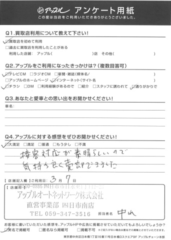 お車のご相談・ 査定だけでもOK! カンタン 入力 30秒 アップルがブランド買取始めました! お電話でも受付中! 受付時間10:00 ~ 18:30 0120-665-977 お車のご相談・ 査定だけでもOK! カンタン 入力 30秒 アップルがブランド買取始めました! お電話でも受付中! 受付時間10:00 ~ 18:30 0120-665-977 アップルがブランド買取始めました! お電話でも受付中! 受付時間10:00 ~ 18:30 0120-665-977 店舗情報 在庫車 スタッフ紹介 ブログ お客様の声 キャンペーン お得 無料査定 click お客様の声 ご記入日: 2017/03/07 T・K様 接客対応が素晴らしいので気持ち良く売却できました 前へ 次へ お客様の声一覧を見る