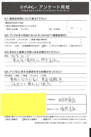 お車のご相談・ 査定だけでもOK! カンタン 入力 30秒 アップルがブランド買取始めました! お電話でも受付中! 受付時間10:00 ~ 18:30 0120-665-977 お車のご相談・ 査定だけでもOK! カンタン 入力 30秒 アップルがブランド買取始めました! お電話でも受付中! 受付時間10:00 ~ 18:30 0120-665-977 アップルがブランド買取始めました! お電話でも受付中! 受付時間10:00 ~ 18:30 0120-665-977 店舗情報 在庫車 スタッフ紹介 ブログ お客様の声 キャンペーン お得 無料査定 click お客様の声 ご記入日: 2018/08/31 T・M様 買取りだけでなく車両情報をしんせつに教えてくれた。 前へ 次へ お客様の声一覧を見る