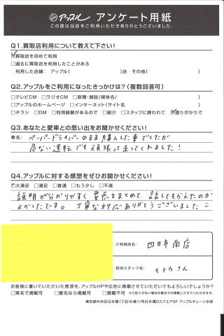 お車のご相談・ 査定だけでもOK! カンタン 入力 30秒 アップルがブランド買取始めました! お電話でも受付中! 受付時間10:00 ~ 18:30 0120-665-977 お車のご相談・ 査定だけでもOK! カンタン 入力 30秒 アップルがブランド買取始めました! お電話でも受付中! 受付時間10:00 ~ 18:30 0120-665-977 アップルがブランド買取始めました! お電話でも受付中! 受付時間10:00 ~ 18:30 0120-665-977 店舗情報 在庫車 スタッフ紹介 ブログ お客様の声 キャンペーン お得 無料査定 click お客様の声 ご記入日: 2018/09/01 R・N様 説明が分かりやすく要点をまとめて話してもらえたのがよかったです。丁寧な対応ありがとうございました。 前へ 次へ お客様の声一覧を見る