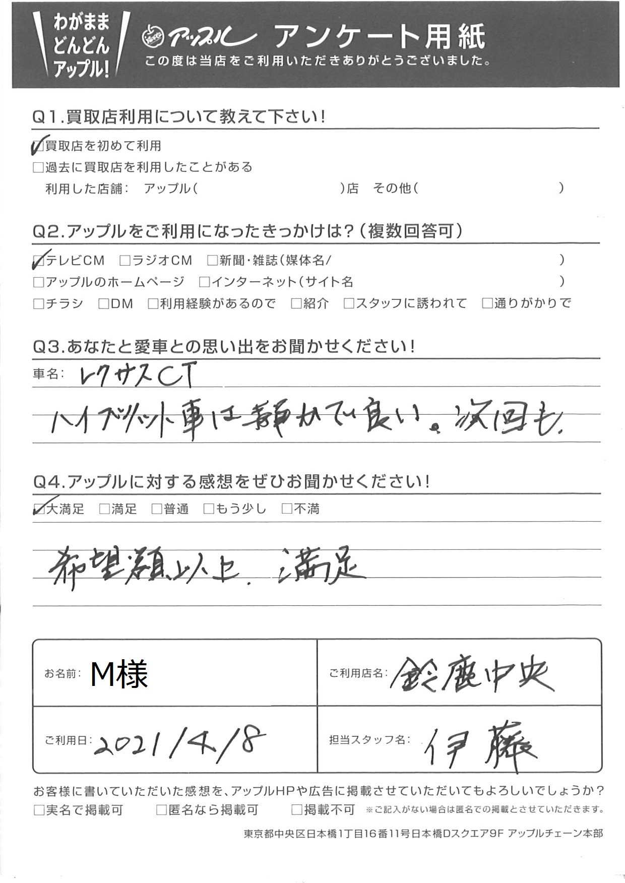 お車のご相談・ 査定だけでもOK! カンタン 入力 30秒 アップルがブランド買取始めました! お電話でも受付中! 受付時間 10:00 ~ 18:30 0120-866-446 お車のご相談・ 査定だけでもOK! カンタン 入力 30秒 アップルがブランド買取始めました! お電話でも受付中! 受付時間 10:00 ~ 18:30 0120-866-446 アップルがブランド買取始めました! お電話でも受付中! 受付時間 10:00 ~ 18:30 0120-866-446 店舗情報 在庫車 スタッフ紹介 ブログ お客様の声 キャンペーン お得 無料査定 click お客様の声 ご記入日: 2021/04/08 M様 車名:レクサス CT (国内仕様 右H) ◎あなたと愛車との思い出をお聞かせください!車名:レクサスCTハイブリッド車は静かで良い。次回も。◎アップルに対する感想をぜひお聞かせください!希望額以上、満足 前へ 次へ お客様の声一覧を見る