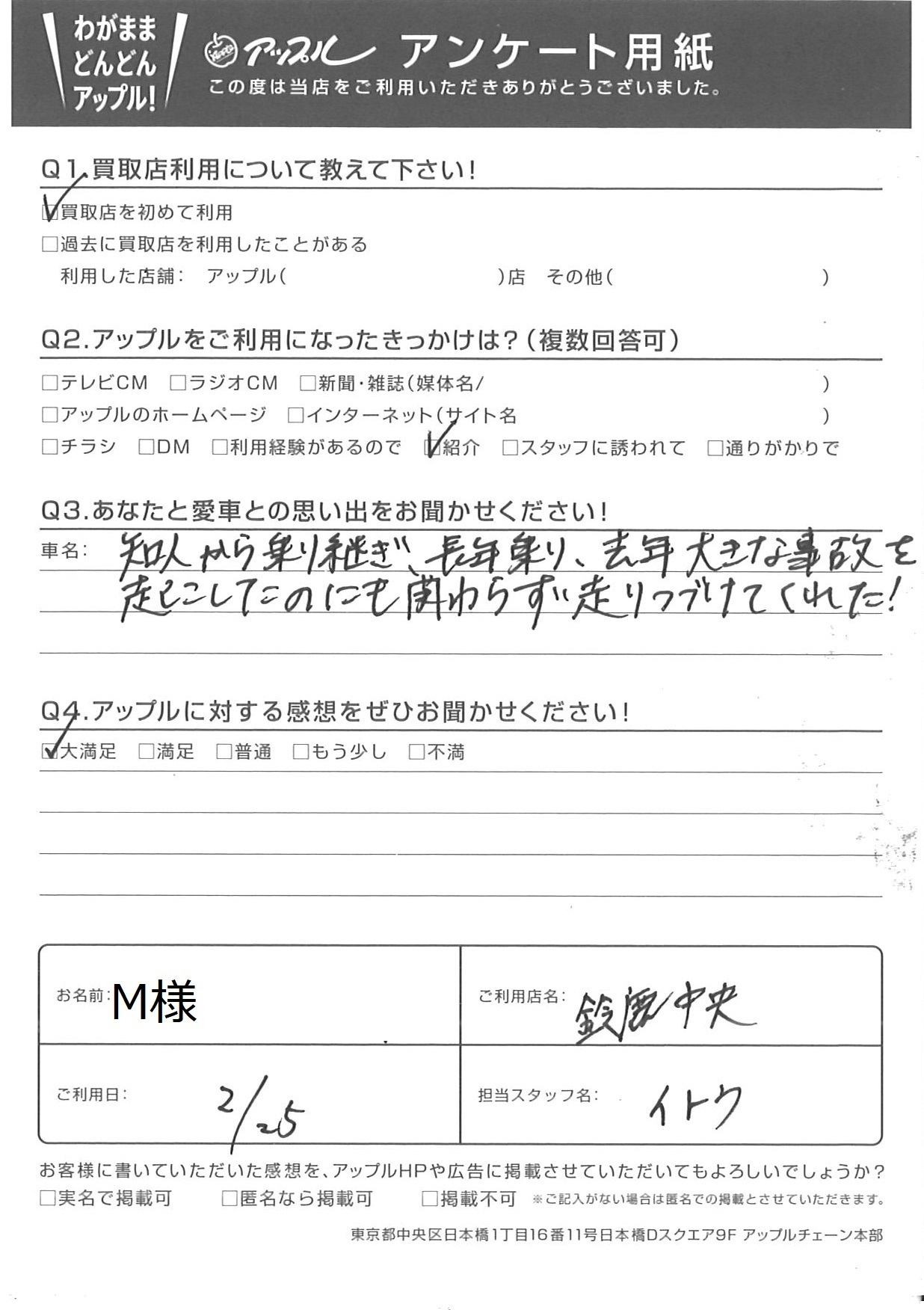 お車のご相談・ 査定だけでもOK! カンタン 入力 30秒 アップルがブランド買取始めました! お電話でも受付中! 受付時間 10:00 ~ 18:30 0120-866-446 お車のご相談・ 査定だけでもOK! カンタン 入力 30秒 アップルがブランド買取始めました! お電話でも受付中! 受付時間 10:00 ~ 18:30 0120-866-446 アップルがブランド買取始めました! お電話でも受付中! 受付時間 10:00 ~ 18:30 0120-866-446 店舗情報 在庫車 スタッフ紹介 ブログ お客様の声 キャンペーン お得 無料査定 click お客様の声 ご記入日: 2021/02/25 M様 ◎あなたと愛車との思い出をお聞かせください!知人から乗り継ぎ、長年乗り、去年大きな事故を起こしたのにも関わらず走り続けてくれた!◎アップルに対する感想をぜひお聞かせください!大満足 前へ 次へ お客様の声一覧を見る