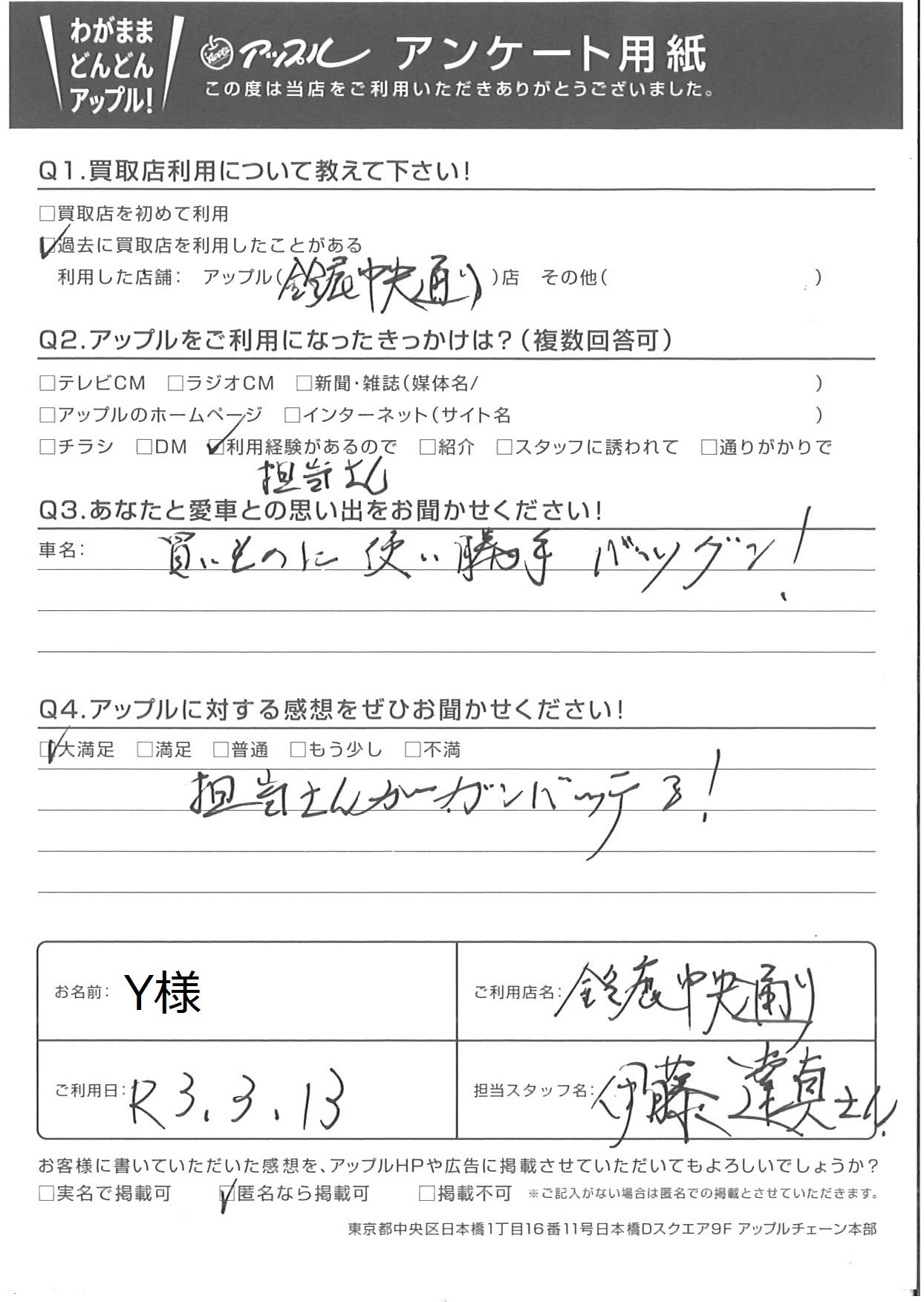 お車のご相談・ 査定だけでもOK! カンタン 入力 30秒 アップルがブランド買取始めました! お電話でも受付中! 受付時間 10:00 ~ 18:30 0120-866-446 お車のご相談・ 査定だけでもOK! カンタン 入力 30秒 アップルがブランド買取始めました! お電話でも受付中! 受付時間 10:00 ~ 18:30 0120-866-446 アップルがブランド買取始めました! お電話でも受付中! 受付時間 10:00 ~ 18:30 0120-866-446 店舗情報 在庫車 スタッフ紹介 ブログ お客様の声 キャンペーン お得 無料査定 click お客様の声 ご記入日: 2021/03/13 Y様 ◎あなたと愛車との思い出をお聞かせください!買い物に使い勝手バツグン!◎アップルに対する感想をぜひお聞かせください!担当さんがガンバっている! 前へ 次へ お客様の声一覧を見る