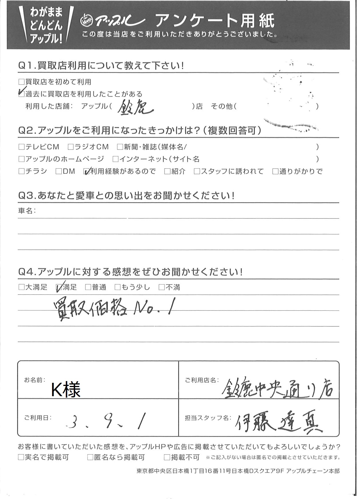 お車のご相談・ 査定だけでもOK! カンタン 入力 30秒 アップルがブランド買取始めました! お電話でも受付中! 受付時間 10:00 ~ 18:30 0120-866-446 お車のご相談・ 査定だけでもOK! カンタン 入力 30秒 アップルがブランド買取始めました! お電話でも受付中! 受付時間 10:00 ~ 18:30 0120-866-446 アップルがブランド買取始めました! お電話でも受付中! 受付時間 10:00 ~ 18:30 0120-866-446 店舗情報 在庫車 スタッフ紹介 ブログ お客様の声 キャンペーン お得 無料査定 click お客様の声 ご記入日: 2021/09/01 K様 ◎アップルに対する感想をぜひお聞かせください!買取価格No.1 前へ 次へ お客様の声一覧を見る