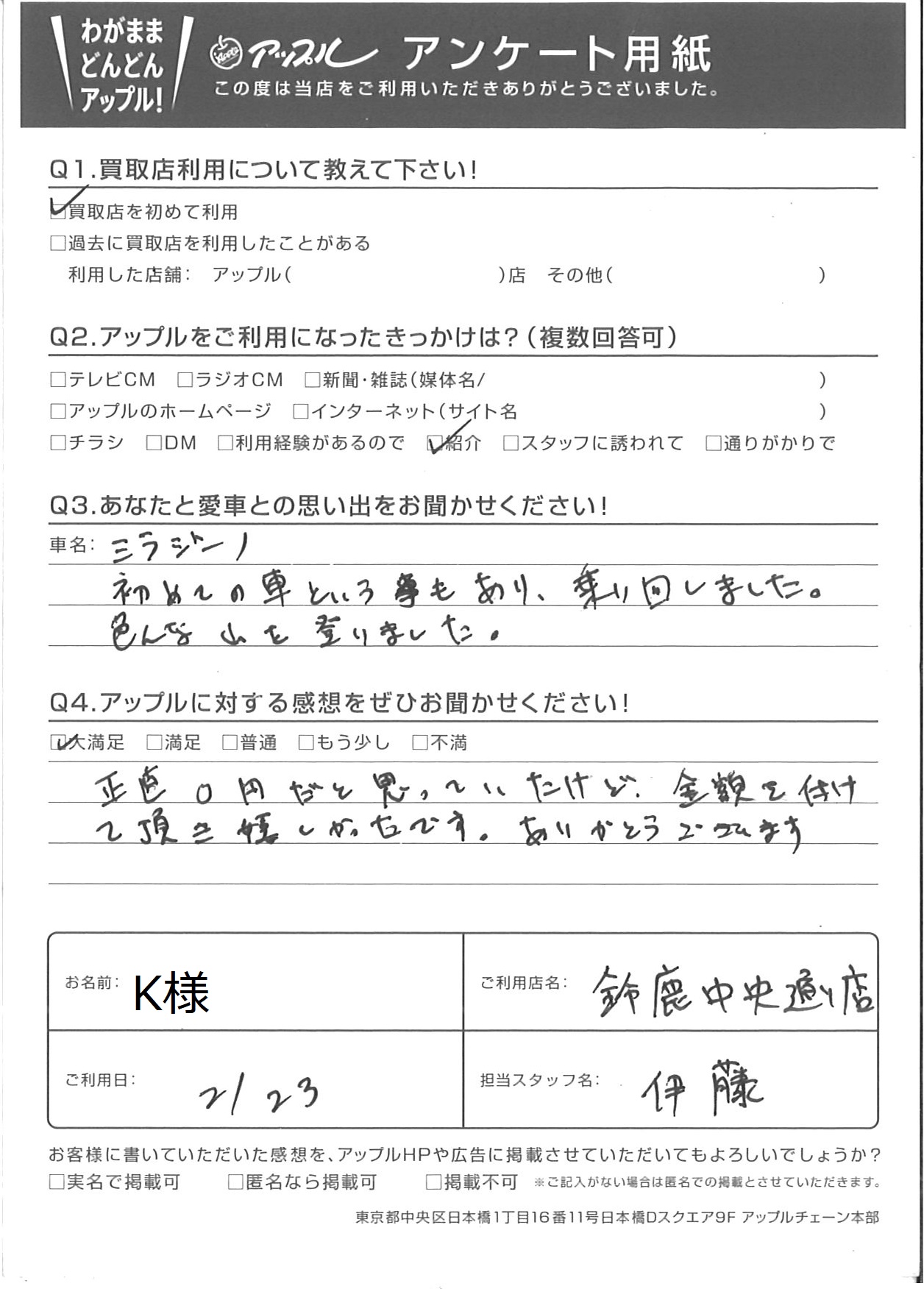 お車のご相談・ 査定だけでもOK! カンタン 入力 30秒 アップルがブランド買取始めました! お電話でも受付中! 受付時間 10:00 ~ 18:30 0120-866-446 お車のご相談・ 査定だけでもOK! カンタン 入力 30秒 アップルがブランド買取始めました! お電話でも受付中! 受付時間 10:00 ~ 18:30 0120-866-446 アップルがブランド買取始めました! お電話でも受付中! 受付時間 10:00 ~ 18:30 0120-866-446 店舗情報 在庫車 スタッフ紹介 ブログ お客様の声 キャンペーン お得 無料査定 click お客様の声 ご記入日: 2021/02/23 K様 車名:ダイハツ ミラジーノ ◎あなたと愛車との思い出をお聞かせください!車名:ミラジーノ初めての車という事もあり、乗り回しました。色んな山を登りました。◎アップルに対する感想をぜひお聞かせください!正直0円だと思っていたけど、金額をつけて頂き嬉しかったです。ありがとうございます。 前へ 次へ お客様の声一覧を見る