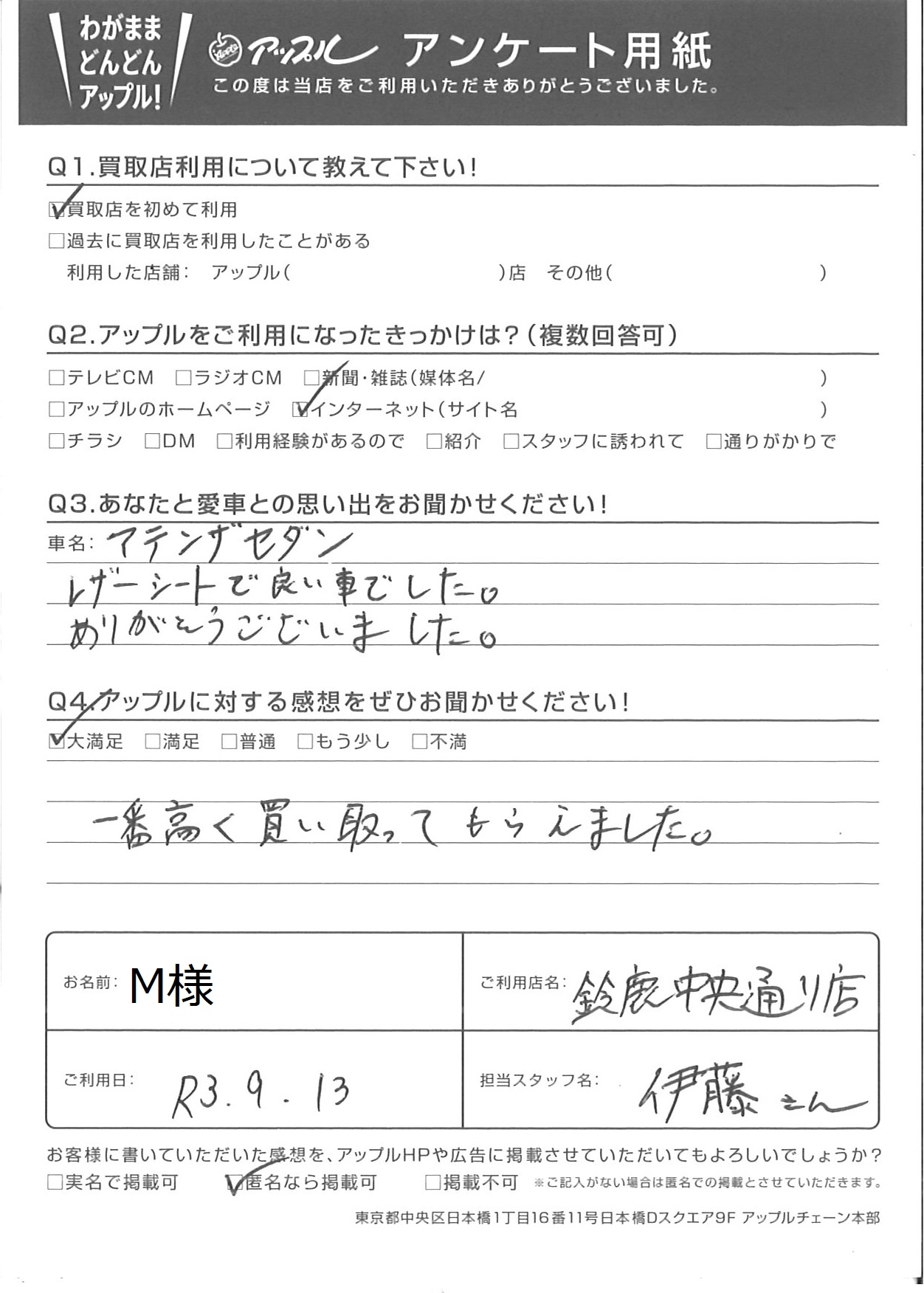 お車のご相談・ 査定だけでもOK! カンタン 入力 30秒 アップルがブランド買取始めました! お電話でも受付中! 受付時間 10:00 ~ 18:30 0120-866-446 お車のご相談・ 査定だけでもOK! カンタン 入力 30秒 アップルがブランド買取始めました! お電話でも受付中! 受付時間 10:00 ~ 18:30 0120-866-446 アップルがブランド買取始めました! お電話でも受付中! 受付時間 10:00 ~ 18:30 0120-866-446 店舗情報 在庫車 スタッフ紹介 ブログ お客様の声 キャンペーン お得 無料査定 click お客様の声 ご記入日: 2021/09/13 M様 車名:マツダ アテンザ ◎あなたと愛車との思い出をお聞かせください!車名:アテンザセダンレザーシートで良い車でした。ありがとうございました。◎アップルに対する感想をぜひお聞かせください一番高く買い取ってもらえました。 前へ 次へ お客様の声一覧を見る